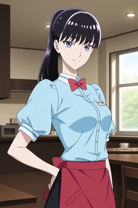 tachibana akira, 长发, 马尾辫, 黑发, 紫色眼睛, 短袖, 蓬松短袖, 蓝色衬衫, 有领衬衫, 姓名牌, 红色蝴蝶结领结, 黑色裙子, 中长裙, 红色围裙, 白色过膝袜, 乐福鞋