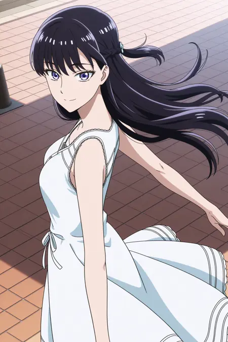 tachibana akira, 长发, 黑发, 半扎发辫, 发饰, 紫色眼睛, 白色连衣裙, 中长裙, 无袖, 露肩, 白色鞋履, 细带高跟鞋, 脚趾甲油