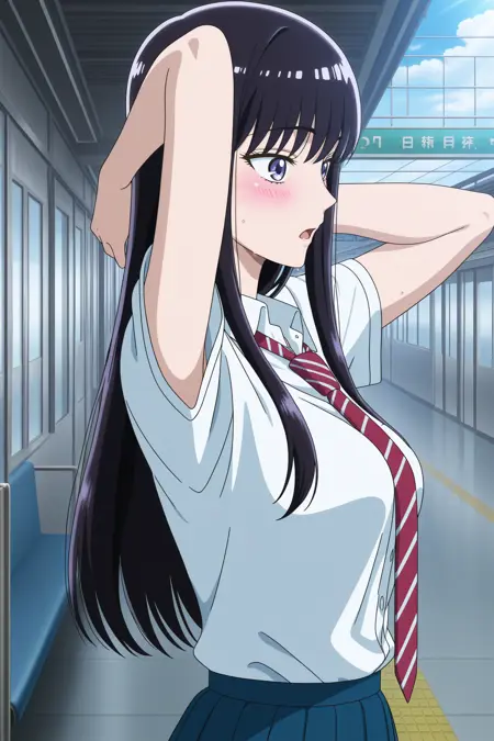 tachibana akira, 长发, 黑发, 紫色眼睛, 校服, 白色衬衫, 有领衬衫, 袖子卷起, 红色领带, 条纹领带, 黄色开衫, 开衫系在腰间, 蓝色裙子, 百褶裙, 黑色过膝袜, 乐福鞋