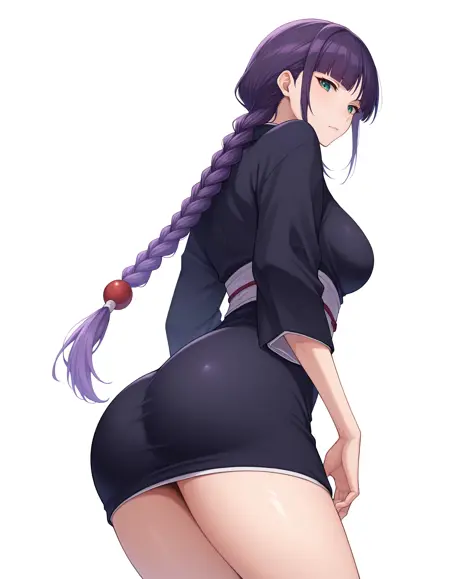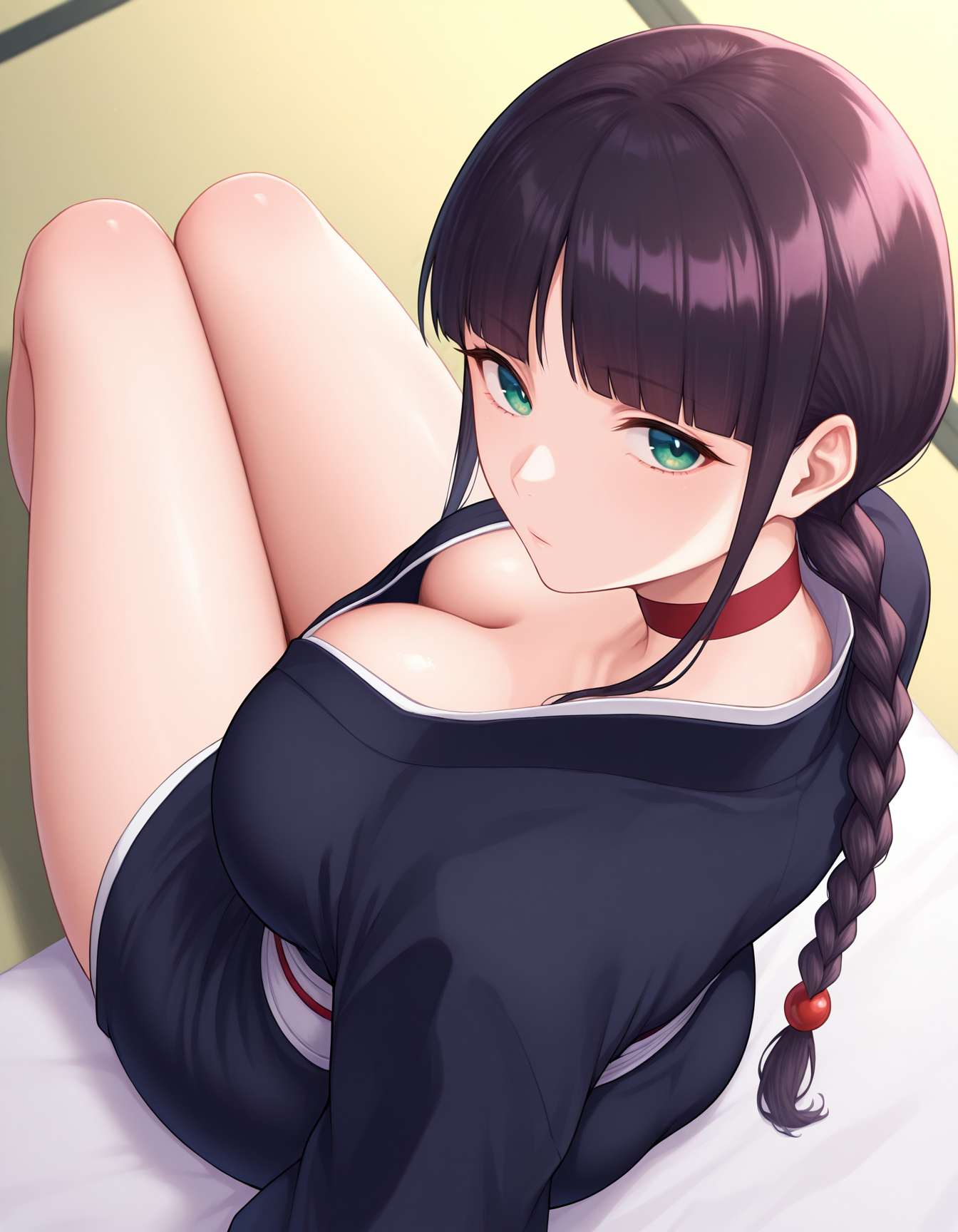 ベース: n3mu、黒髪、まっすぐな前髪、編み込みのポニーテール、緑の目