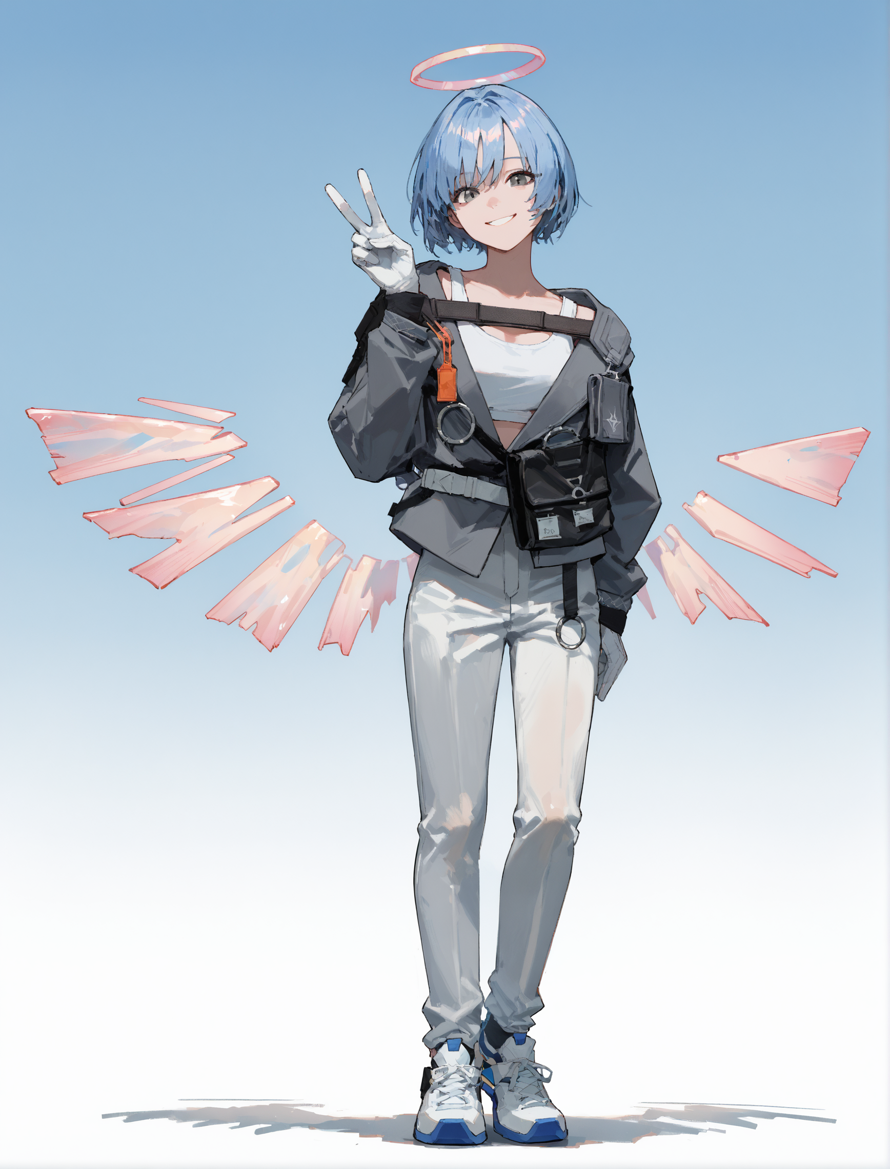 Spuria, halo, energy wings, blue hair, short hair, grey eyes,