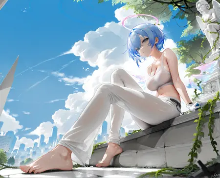 Spuria, halo, energy wings, blue hair, short hair, grey eyes,