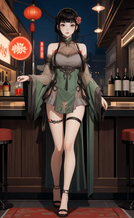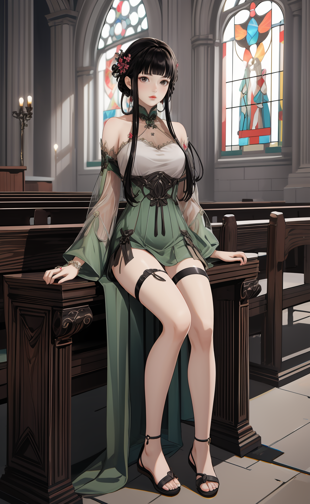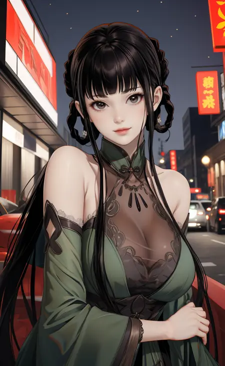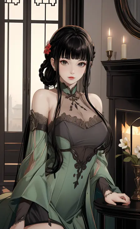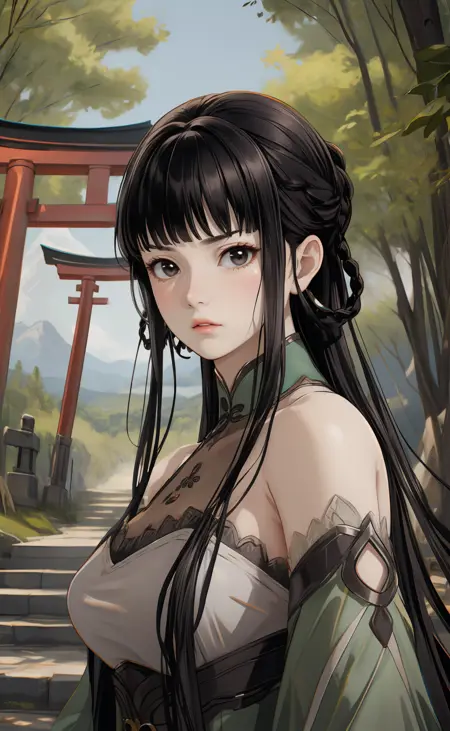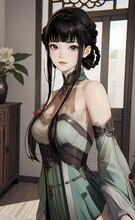 aigirl008v3,1girl,black hair,long hair,blunt bangs,braid,sidelocks,hair rings,hair ornament,round face,black eyes,lips,medium breasts