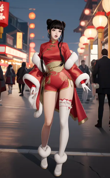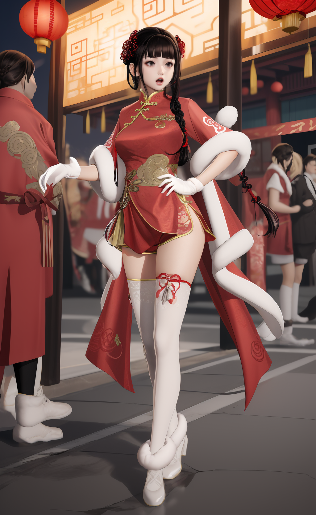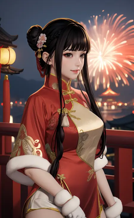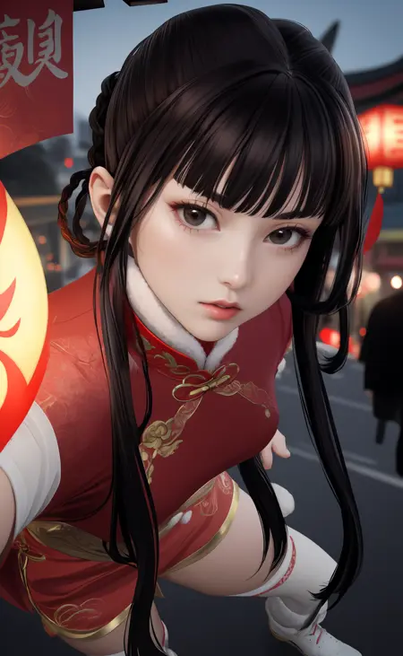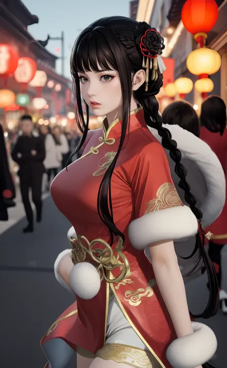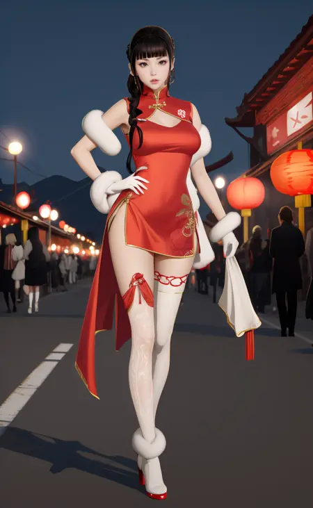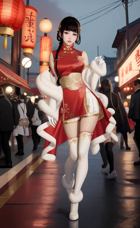 | 训练词汇 | aigirl008v2,1girl,black hair,long hair,blunt bangs,braid,hair rings,sidelocks,black eyes,medium breasts已复制! chinese clothes,dress,red dress,fur trim,gloves,shorts,white shorts,socks,thighhighs,single thighhigh,white footwear,boots,high heels已复制! |