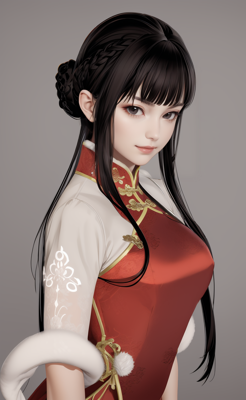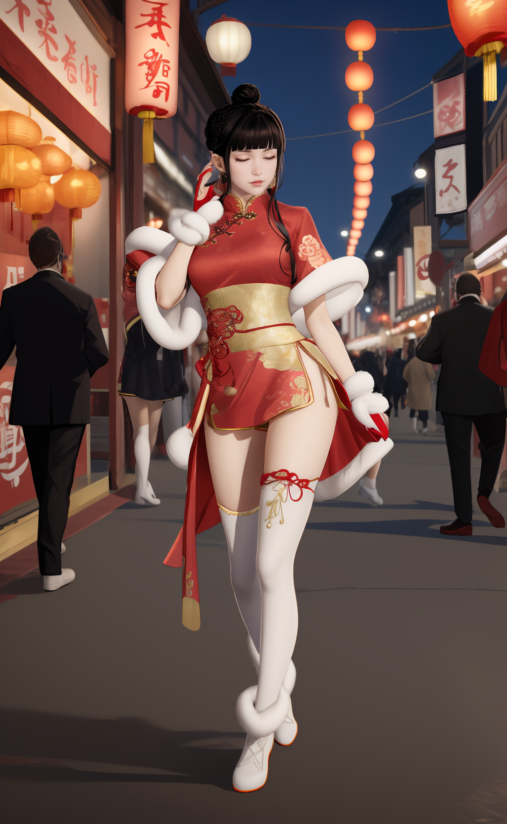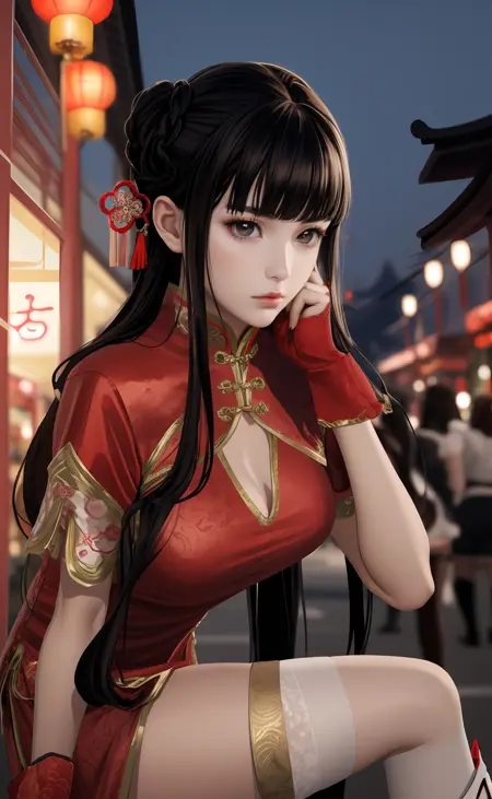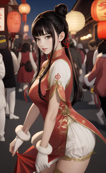 | 训练词汇 | aigirl008v2,1girl,black hair,long hair,blunt bangs,braid,hair rings,sidelocks,black eyes,medium breasts已复制! chinese clothes,dress,red dress,fur trim,gloves,shorts,white shorts,socks,thighhighs,single thighhigh,white footwear,boots,high heels已复制! |