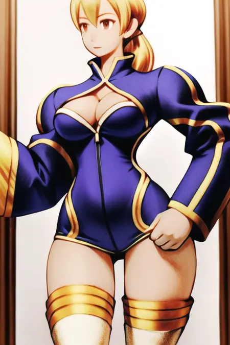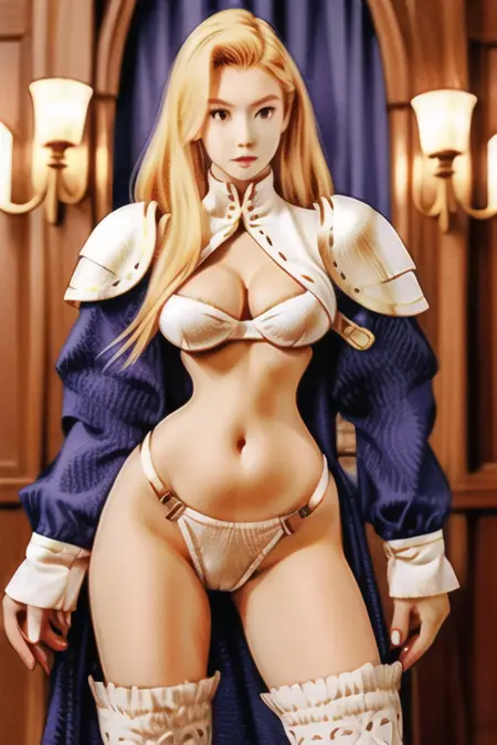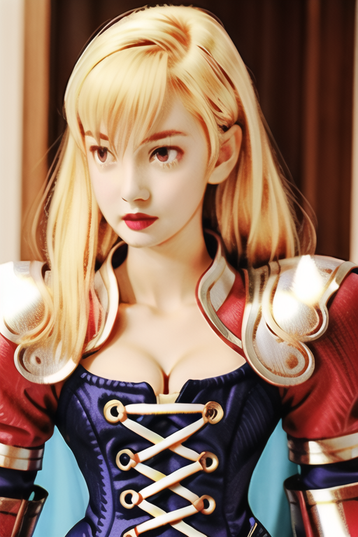 1boy, 1girl, blonde hair, orange hair, light brown hair, braid, ponytail, cowlick, armor, black armor, gold armor, helmet, winged helmet, couter, cuisses, poleyn, greaves, sabaton, gauntets, pauldrons, shoulder armor, hat, bonnet, apron, unitard, leotard, knight, witch, wizard, ninja, samurai, robe, dress, pleated dress, coat, shirt, hakama pants, hooded sweater, tunic, thigh boots, gloves, cape, buckle, ribbon, hair ribbon, sash, loose belt, bow, jewelry, bracelets, scowl, looking to the side, arms at sides, clenched hand, clenched hands, legs apart, holding sword, holding katana, holding cane, bare legs, bare shoulders, cleavage, abs, bald, old man, beardまた、一部の女性キャラクターのデザインを改造し、胸を露出させたバージョンも用意しました。以下のタグを試してください: