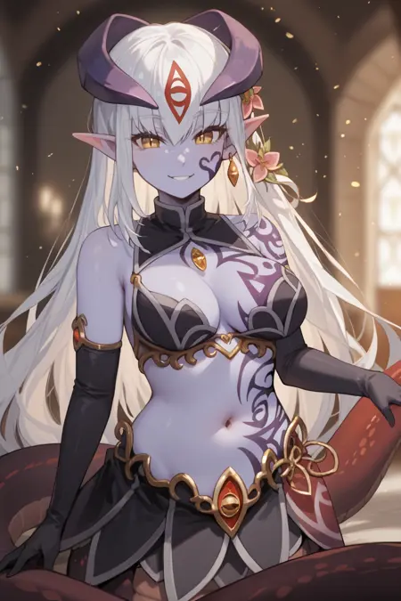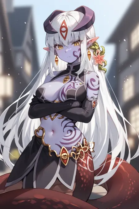 阿利菲丝,白发,长发,蛇女,黄眼,胸纹身,怪物女孩,蛇娘,紫色纹身,尖耳,角,有色皮肤,紫色皮肤,竖瞳,鳞片,面部纹身,手套,肘套,裙子,胸罩,珠宝,发饰,耳环,