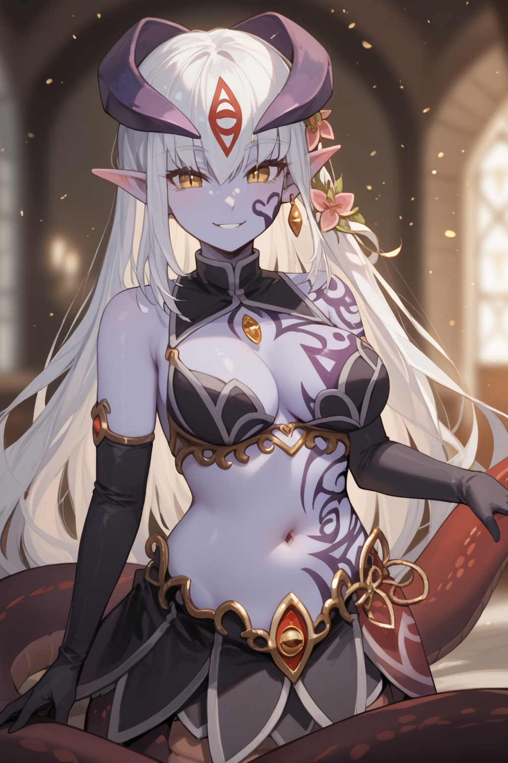 Alipheese, white hair, long hair, lamia, yellow eyes, breast tattoo, monster girl, snake girl, purple tattoos, pointy ears, horns, colored skin, purple skin, slit pupils, scales, face tattoo, gloves, elbow gloves, skirt, bra, jewelry, hair ornament, earrings,