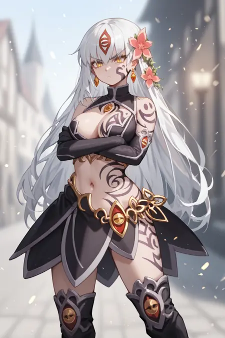 阿利菲丝,白发,长发,黄眼,胸纹身,人类,紫色纹身,竖瞳,面部纹身,手套,肘套,裙子,胸罩,珠宝,发饰,耳环,黑色大腿靴,