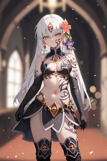 Alipheese, white hair, long hair, yellow eyes, breast tattoo, human, purple tattoos, slit pupils, face tattoo, gloves, elbow gloves, skirt, bra, jewelry, hair ornament, earrings, black thigh_boots,