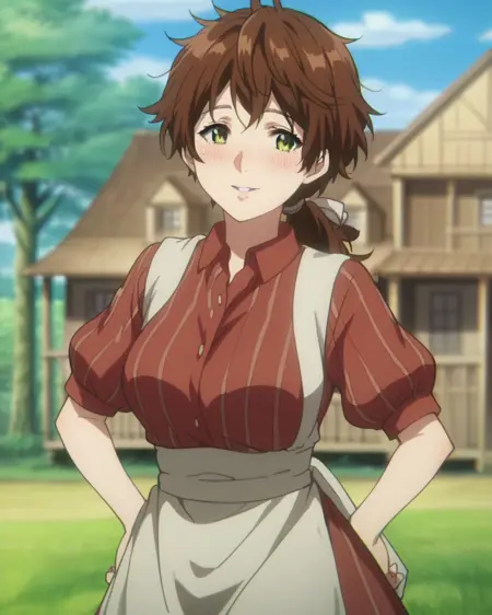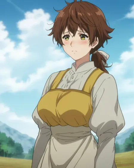 - 1girl, solo, maria, 緑の目, 茶色の目, 茶色の髪, 長い髪, ポニーテール, 低めのポニーテール, 胸, 大きな胸,