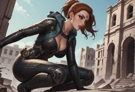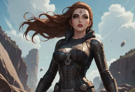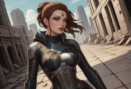 1girl, facial mark, tattoo, large breasts, lipstick, facial mark, eye liner, make up, green eyes, brown hair, pony tail hair, black body suit, lowered hood, armored body suit,