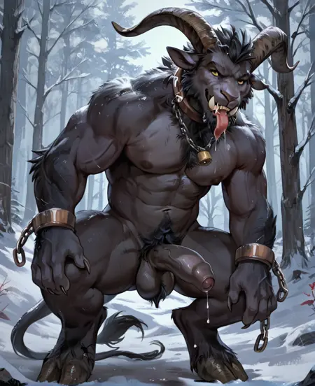 Tags: kr4mpus, monster, creature, goat horns, muscular, claws, long tongue, black skin, black fur, teeth, sharp teeth, digitigrade, hooves, tusks, shackles...