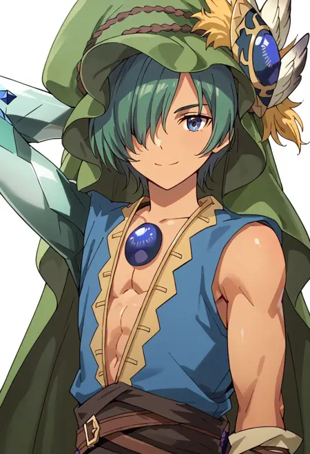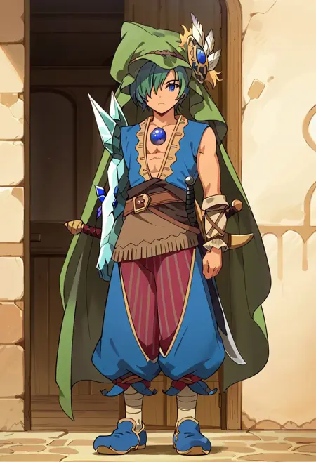 Elazul, 1boy, male_focus, green hair, hair over one eye, blue eyes, olive skin, blue jewel, crystal arm, blue vest, green cape, blue pants, belt, shoes, sword, scabbard