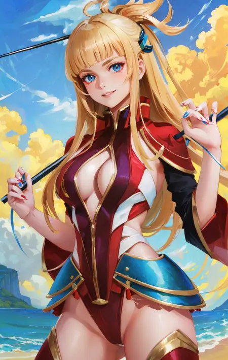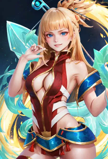 ((big breasts)), 1girl, solo, long hair, looking at viewer, smile, blue eyes, skirt, blonde hair, large breasts, brown hair, hair ornament, thighhighs, animal ears, cleavage, bare shoulders, medium breasts, pantyhose, blunt bangs, rabbit ears, lips, crossed arms, hair stick