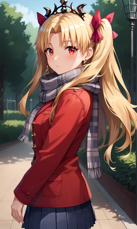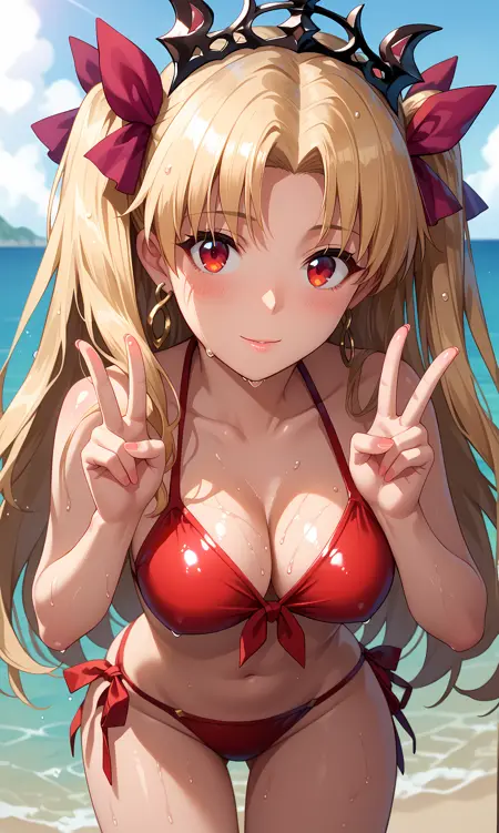 ereshkigal_fgo, 붉은 눈, 금발, 긴 머리, 양측 올려묶기, 갈라진 앞머리, 관모, 헤어 리본, 빨간 리본, 귀걸이, 보석
