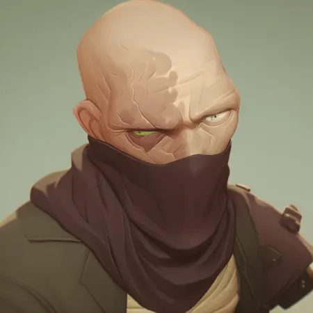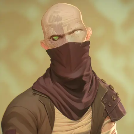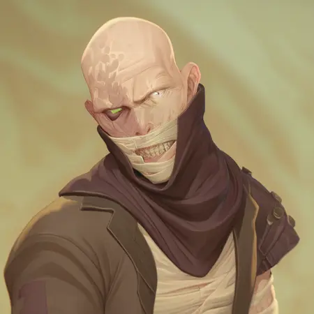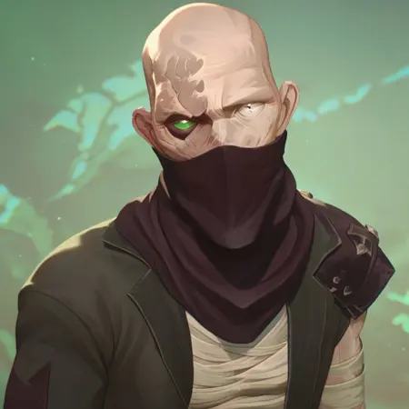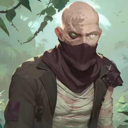 heterochromia, bandages, jacket, green eyes, shirt, scar, bald,