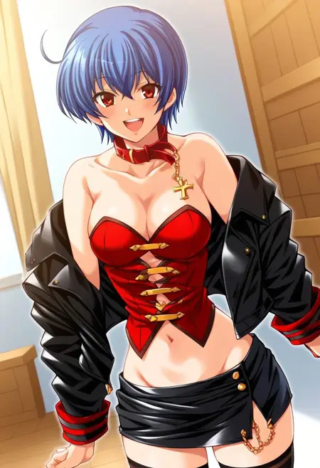 Red Cross collar, black Leather Jacket, black Microskirt,leather microskirt,microskirt,red bustier,midriff,black thighhighs,thighhighs with belt,cleavage,bare shoulders