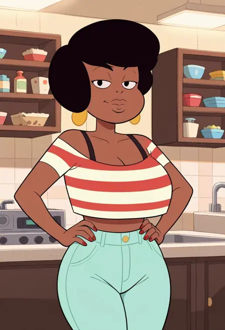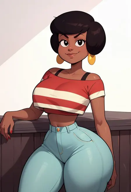 触发词:1girl,单人,Jenny_SU,棕色皮肤,黑色眼睛,大金色圆环耳环,黑发,蓬松鲍伯头,红白条纹露脐上衣,黑色迷你上衣内搭,浅海泡绿色牛仔裤,红色平底鞋