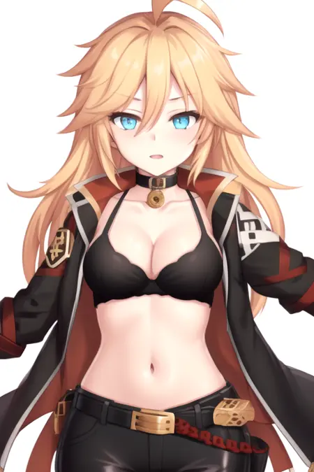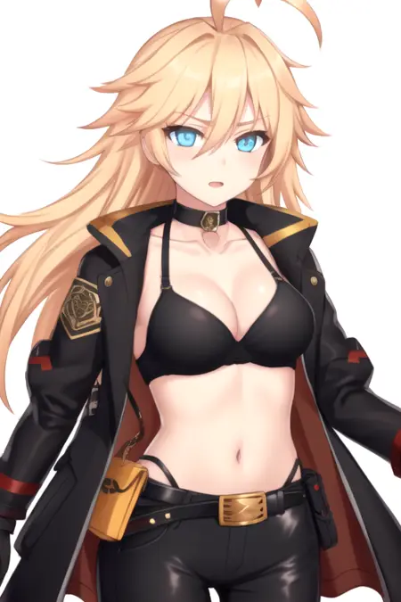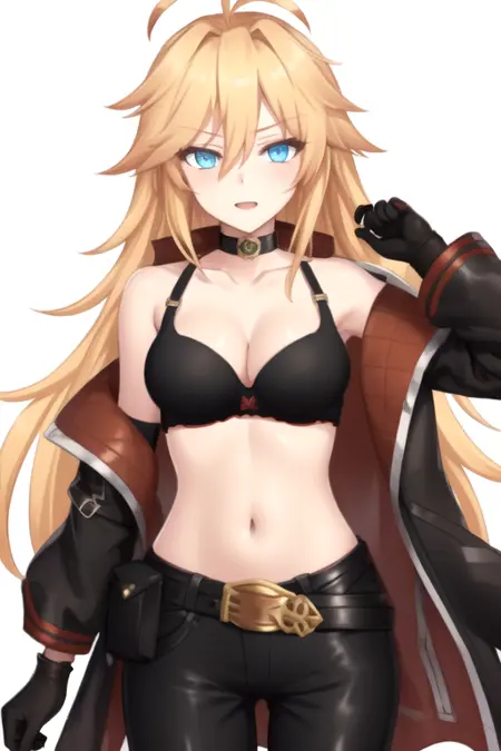 RoseTempestBurster, 1girl, solo, very long hair, blue eyes, blonde hair, medium breasts, gloves, navel, cleavage, collarbone, black jacket, ahoge, midriff, belt, black pants, black bra, open jacket, coat, black choker, belt pouch