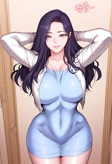 (( lora:oh\_choon-hwa:1 , oh_choon-hwa, thin waist, wide hips, beautiful skin, piercing purple eyes, clear eyes, bright pupils, beautiful eyes, beautiful purple hair, huge and shaggy breasts, natural beauty, extraordinary beautiful woman, attractive woman, super sexy woman, lustful body, sexy woman with seductive obscene body, sensual body, voluptuous body, sexy beauty, no piercings, no piercing, ))