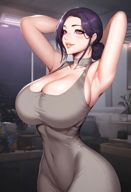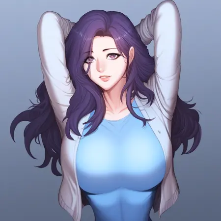 (( lora:oh_choon-hwa:1 , oh_choon-hwa, 纤细腰身,宽臀,美丽肌肤,锐利的紫色眼睛,清澈的眼睛,明亮的瞳孔,美丽的眼睛,漂亮的紫色头发,巨大而蓬松的乳房,自然美,超凡美丽的女性,有魅力的女性,超级性感的女性,欲望的身体,拥有诱惑露骨身材的性感女性,性感身材,丰满身材,性感美,无穿孔,无 piercing,))