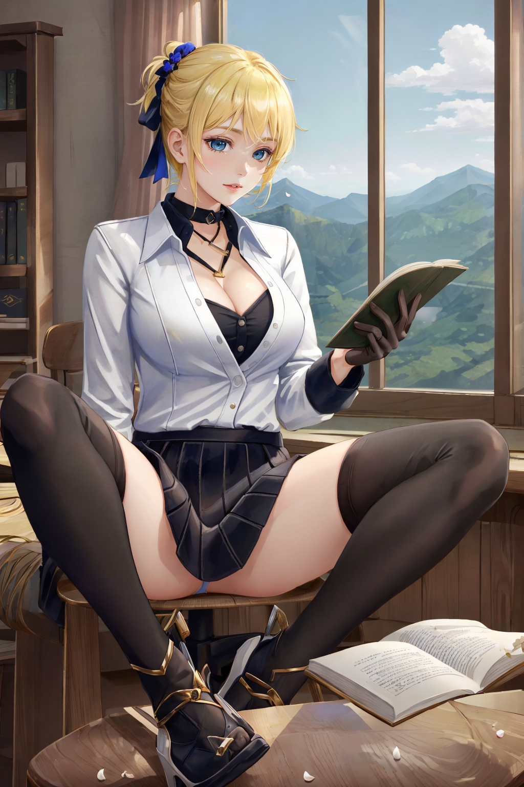 Prompt: ((big breasts)), 1girl, solo, looking at viewer, short hair, skirt, blonde hair, thighhighs, gloves, brown eyes, jewelry, jacket, full body, outdoors, black thighhighs, fingerless gloves, high heels, zettai ryouiki, white jacket, brown gloves