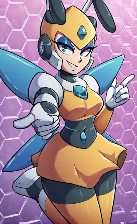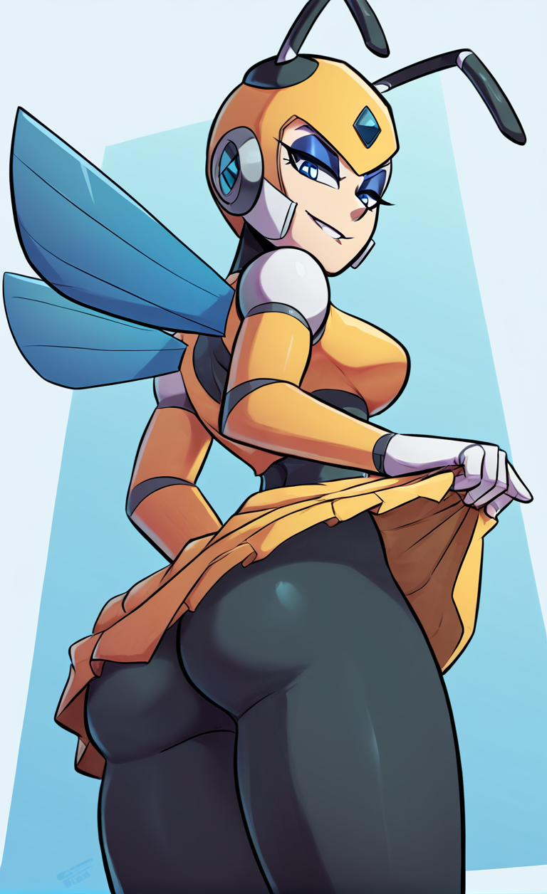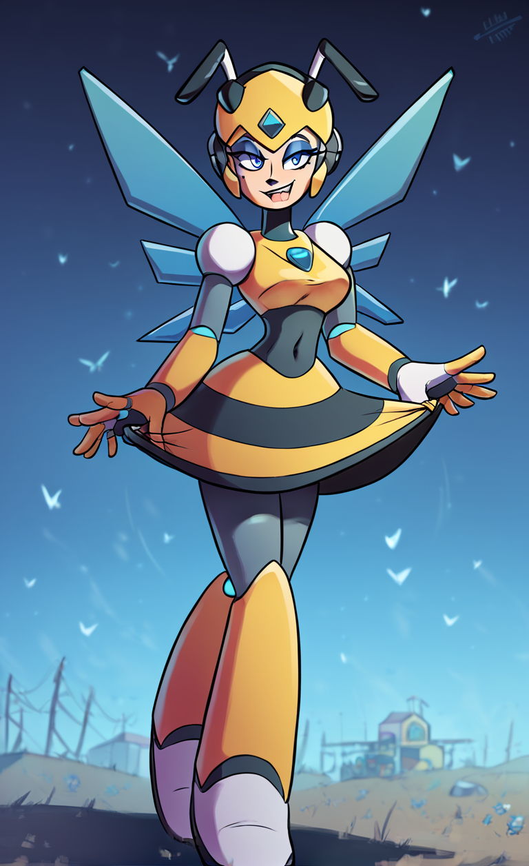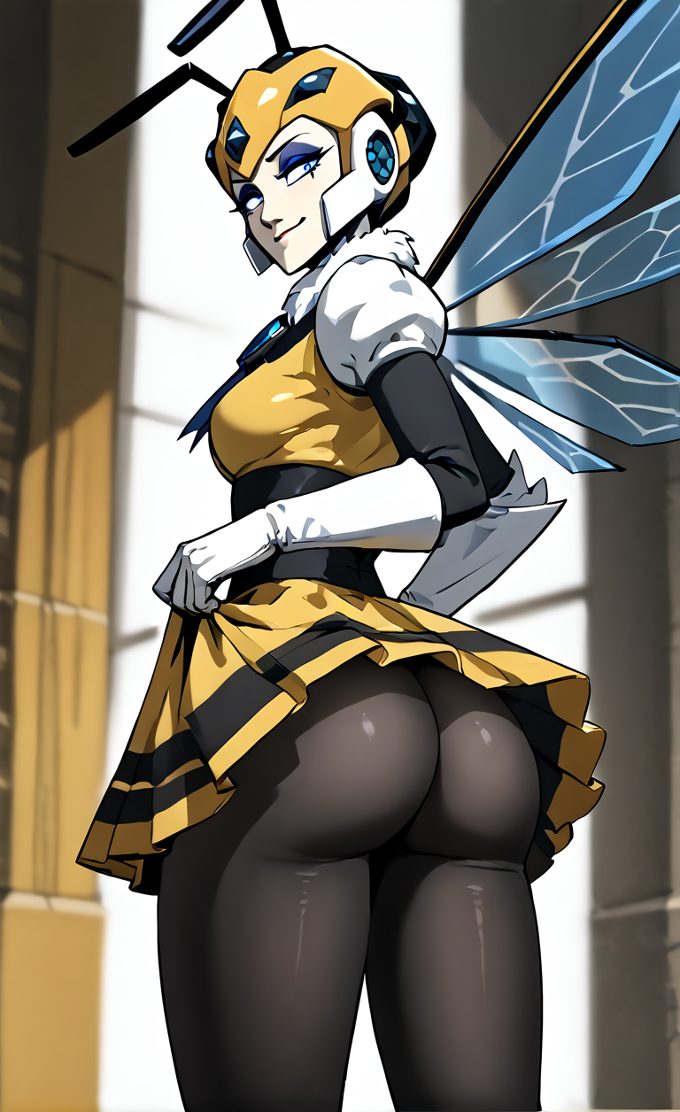 female robot, bee lady, skirt, blue eyes, eyeshadow, wings, black tights, white gloves,