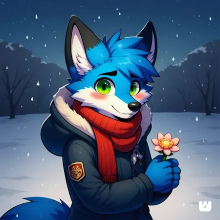 Pazun, fox, blue fur and green eyes, yellow jacket