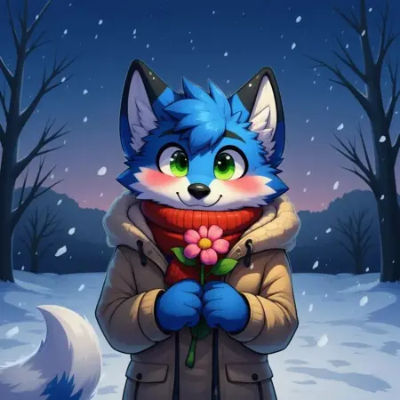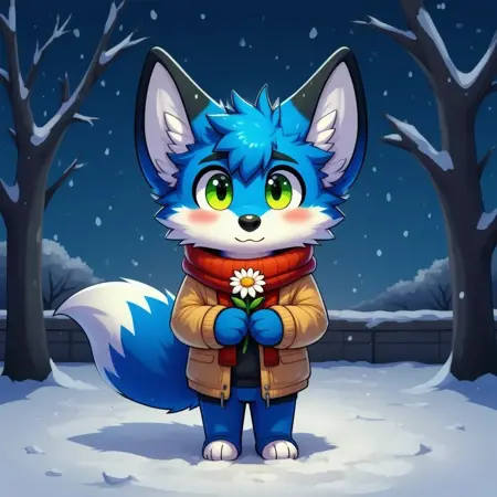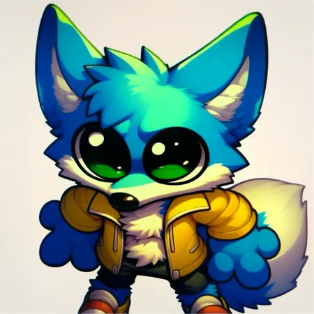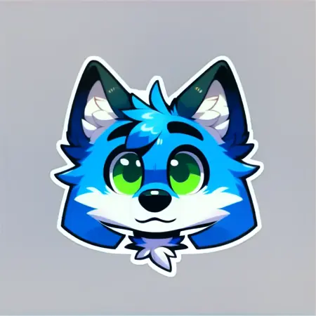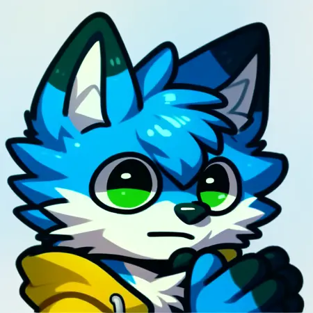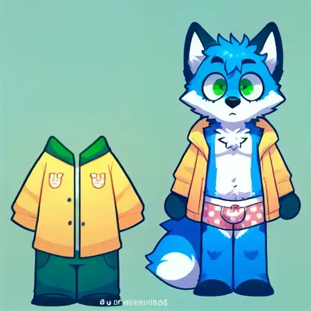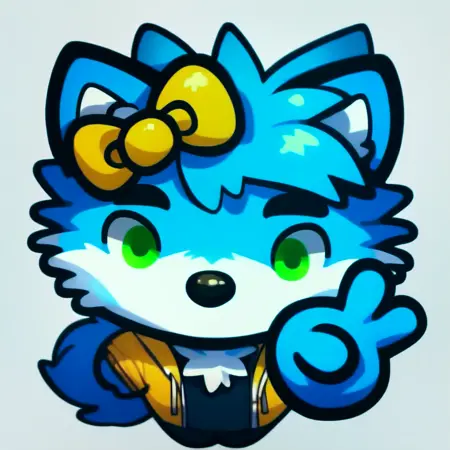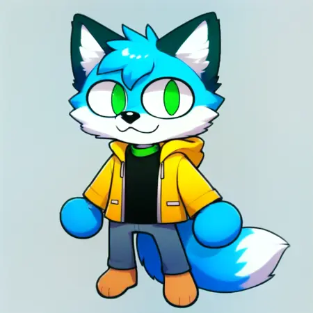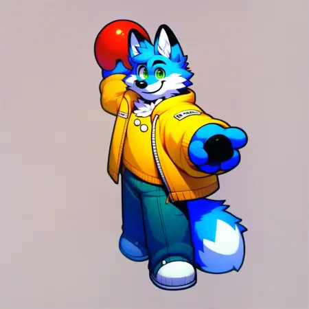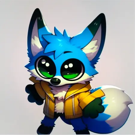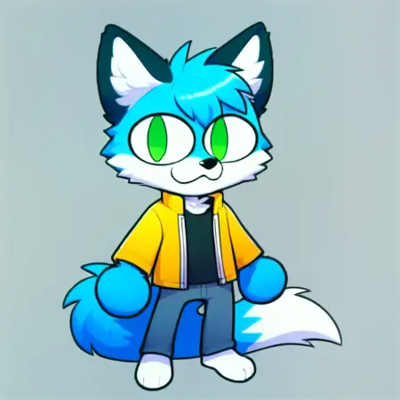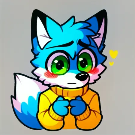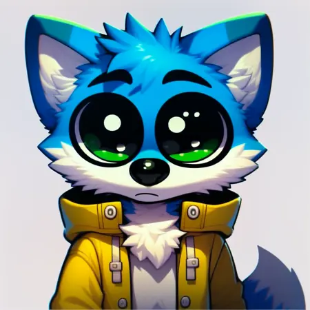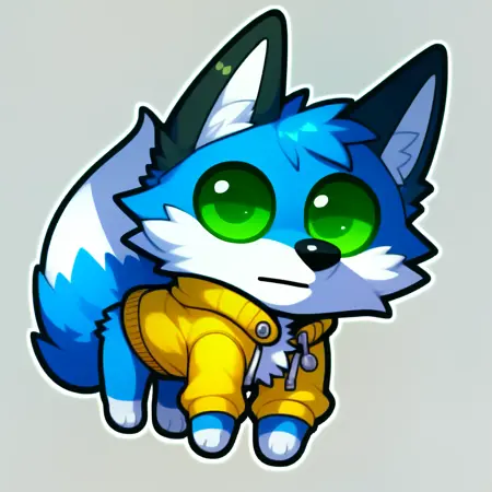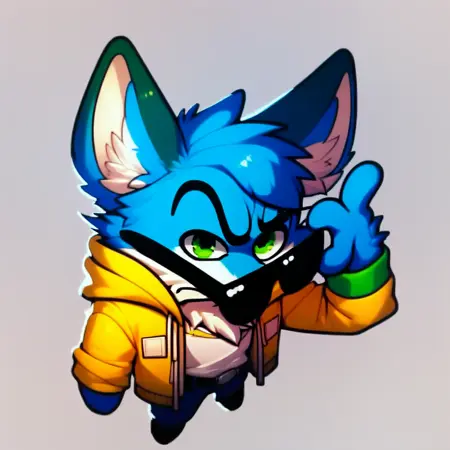 pazun, blue fox, sticker style, fox ears, 1boy, two-tone fur, solo, furry male, green eyes, blue fur, yellow jacket, blush