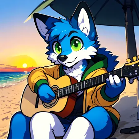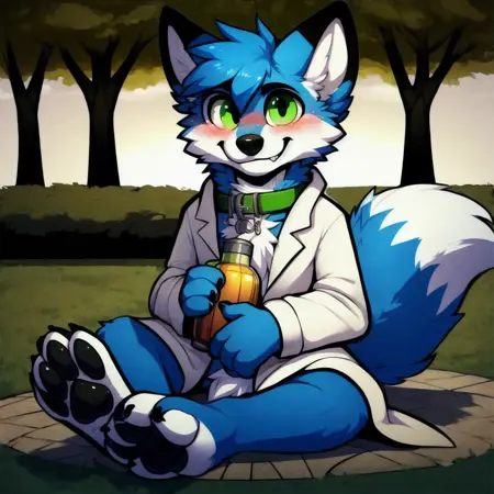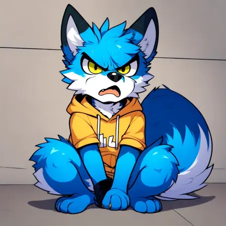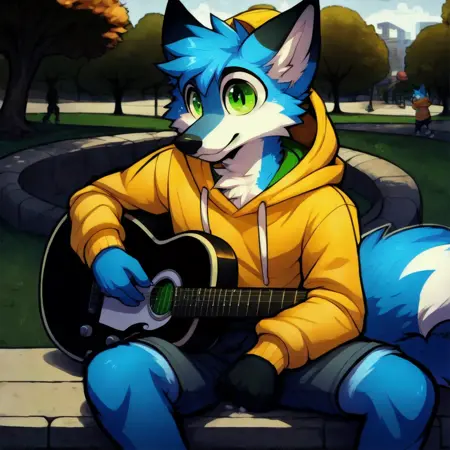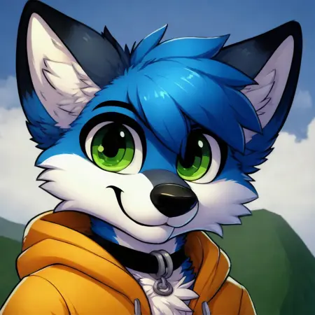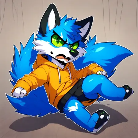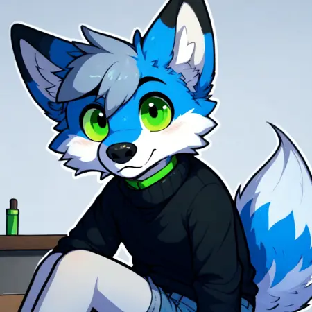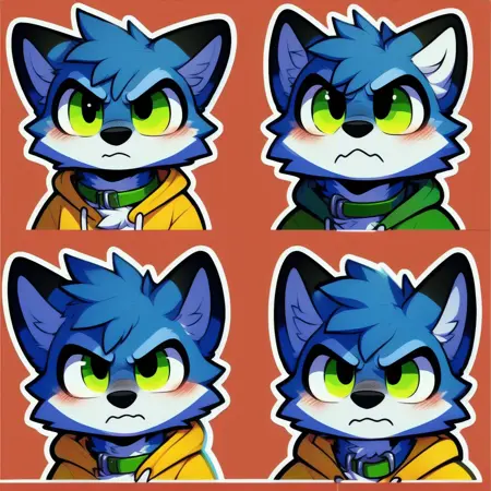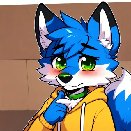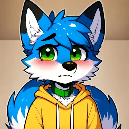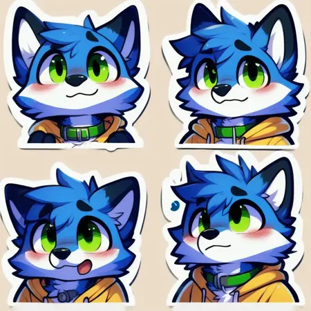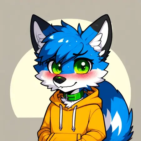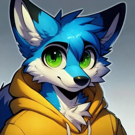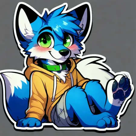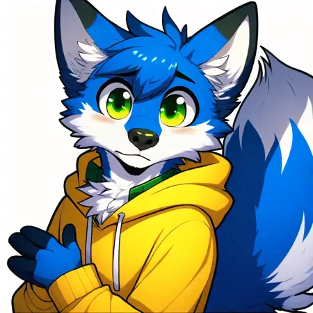 blue fox, sticker style, fox ears, hood, furry, furry male, green eyes, animal ears, hoodie