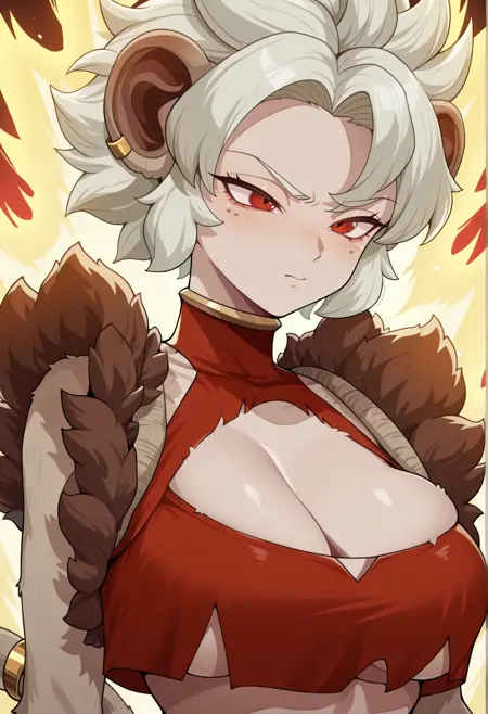 Notable tags: monster girl, female furry, monkey girl, monkey ears, monkey tail, tail ring, short hair, white hair, red eyes, freckles, body fur, gloves, fur trim, revealing clothes, clothing cutout, bell, anklet,
