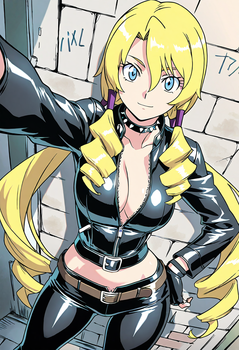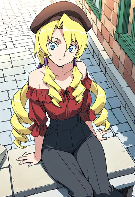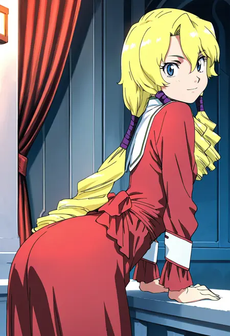 zzLashara,蓝眼睛,头发位于眼睛之间,金发,钻头发型,发管,长发,低双马尾,红裙,