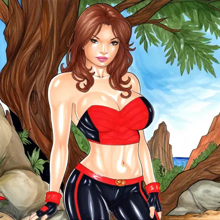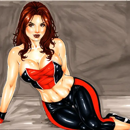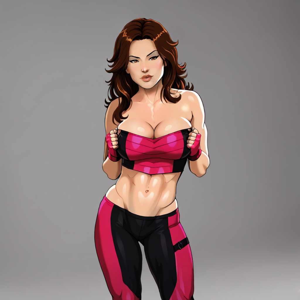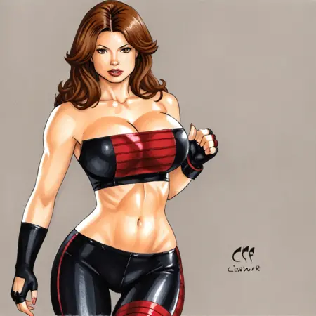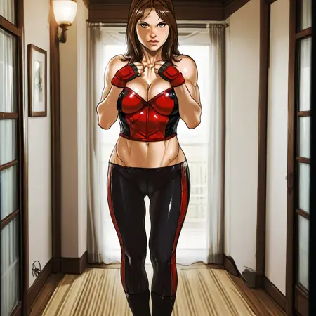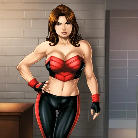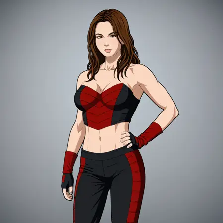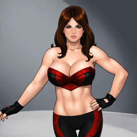 - トリガー:UltimateScarletWitch, 1girl, solo, large breasts, brown hair, cleavage, navel, midriff, fingerless gloves, long hair, bare shoulders, pants, lips, brown eyes, thigh gap, wide hips