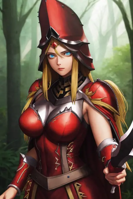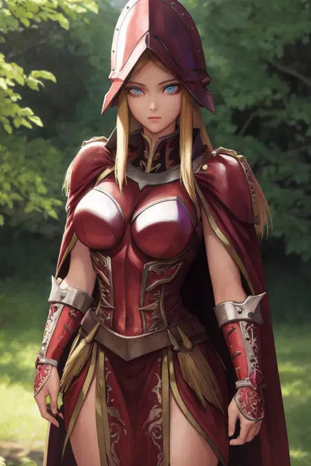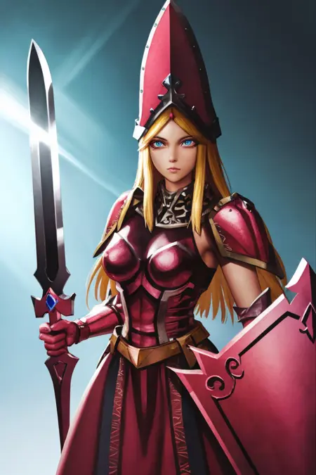 Prompt: queensknight, hat, holding, weapon, heart, boots, sword, holding weapon, holding sword, helmet, shoulder armor, gauntlets, shield, breastplate, duel monster, holding shield