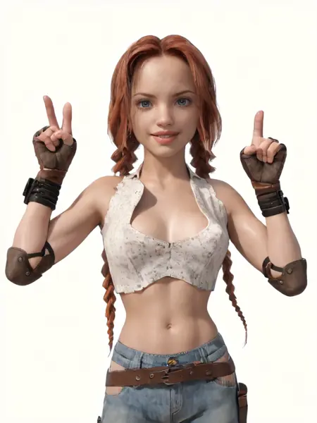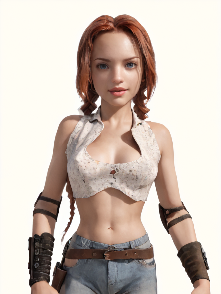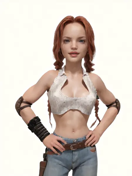 短上衣,深V领,无袖短上衣,露肩,露腹,灰色牛仔裤,侧边开衩,棕色腰带,枪套,