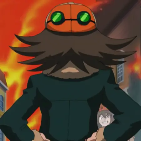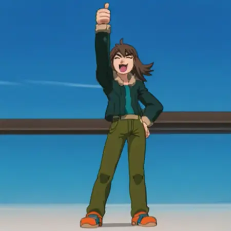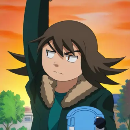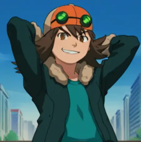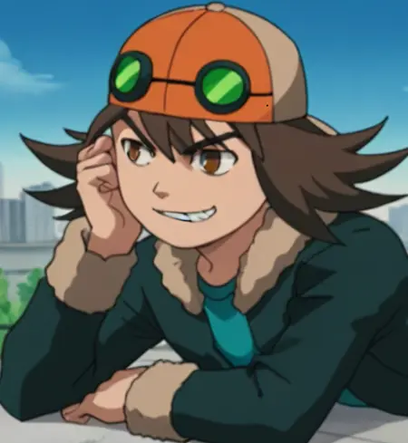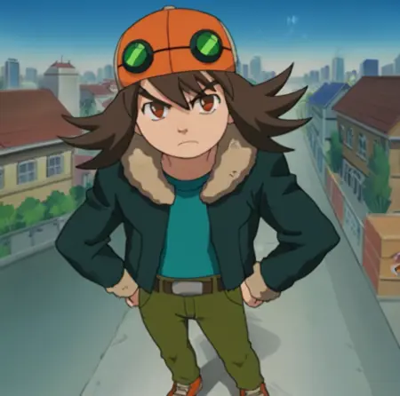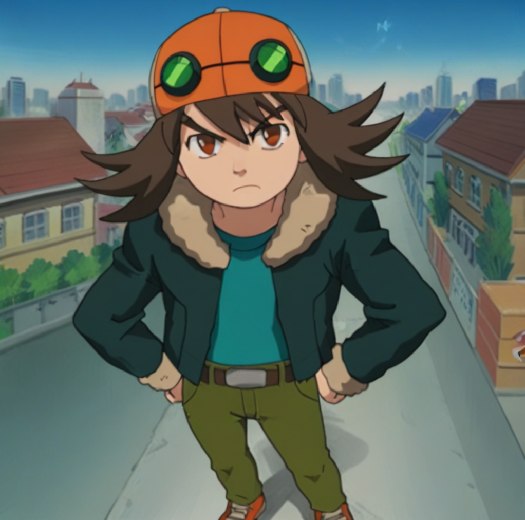 プロンプト: 男性、茶色の髪、茶色の目、帽子、ゴーグル、頭にゴーグル、濃い teal 色のファー Trim ジャケット、明るい teal 色のショートスリーブシャツ、緑のズボン、ベルト、オレンジ色の靴、屋外(都市)
