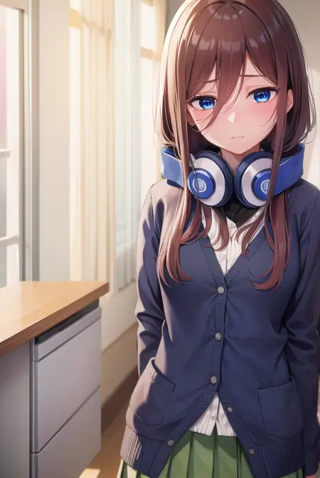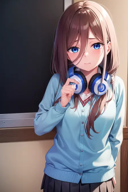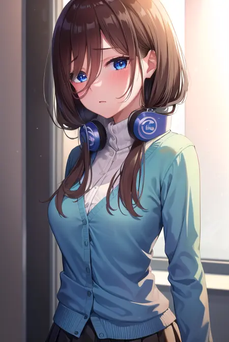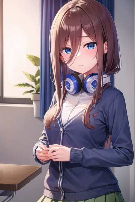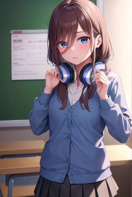 miku nakano, long hair, bangs, blue eyes, brown hair, hair between eyes, headphones, headphones around neck,