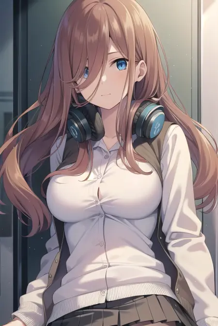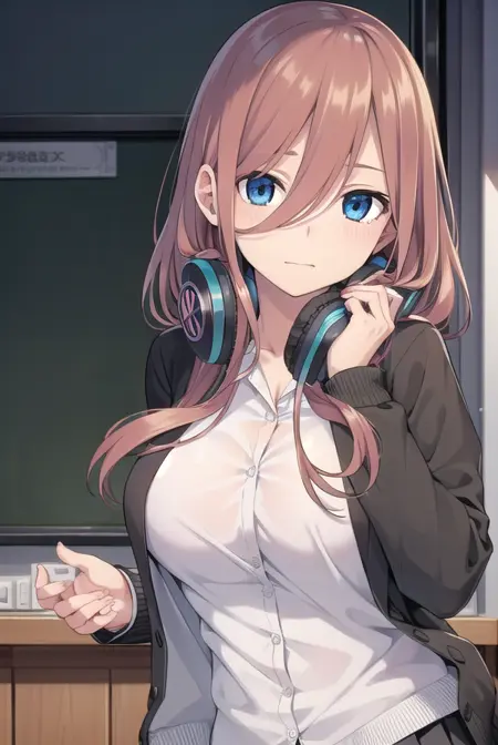 miku nakano, 긴 머리, 앞머리, 파란 눈, 갈색 머리, 눈 사이의 머리카락, 헤드폰, 목에 걸린 헤드폰,