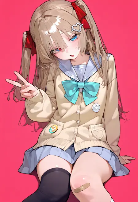 Neuro-sama的服装: 水手服, 白色心形发饰, 校服, 黄色开衫, 水蓝色蝴蝶结, 水蓝色领结, 蓝色短裙, 过膝袜, 单侧过膝袜, 黑色过膝袜, 不对称腿饰, 膝盖上贴着创可贴, 不对称腿饰, 开襟开衫
