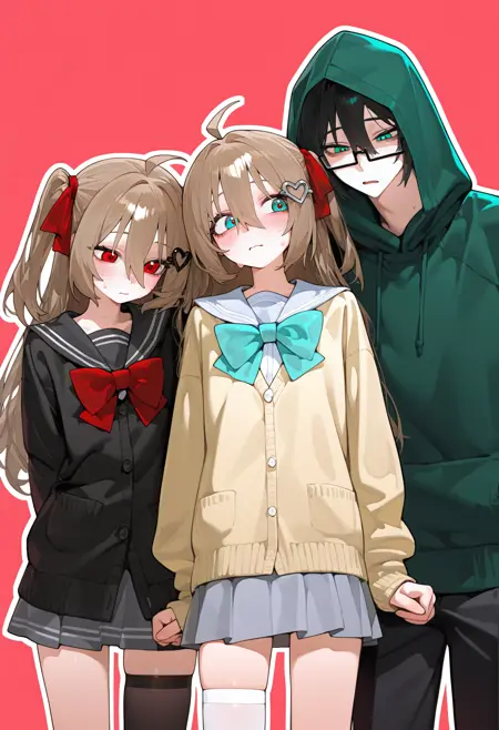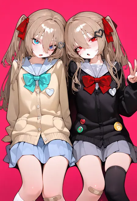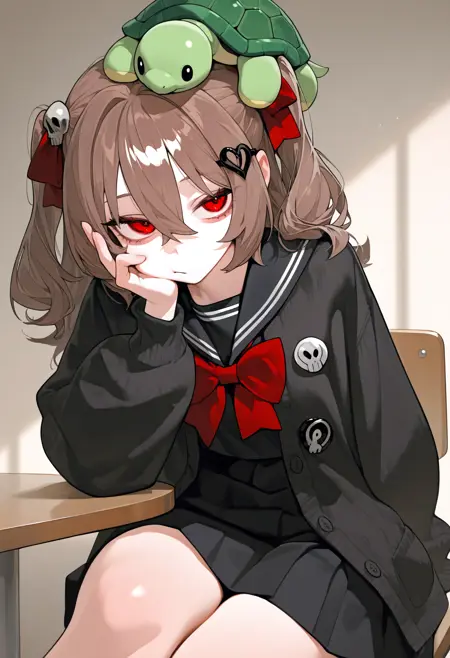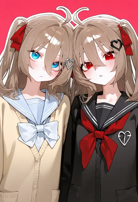 Evil的触发词及外观: evil neuro-sama, 1girl, 棕色头发, 红眼睛, 黑色心形发饰, 红色发带, 双侧高髻