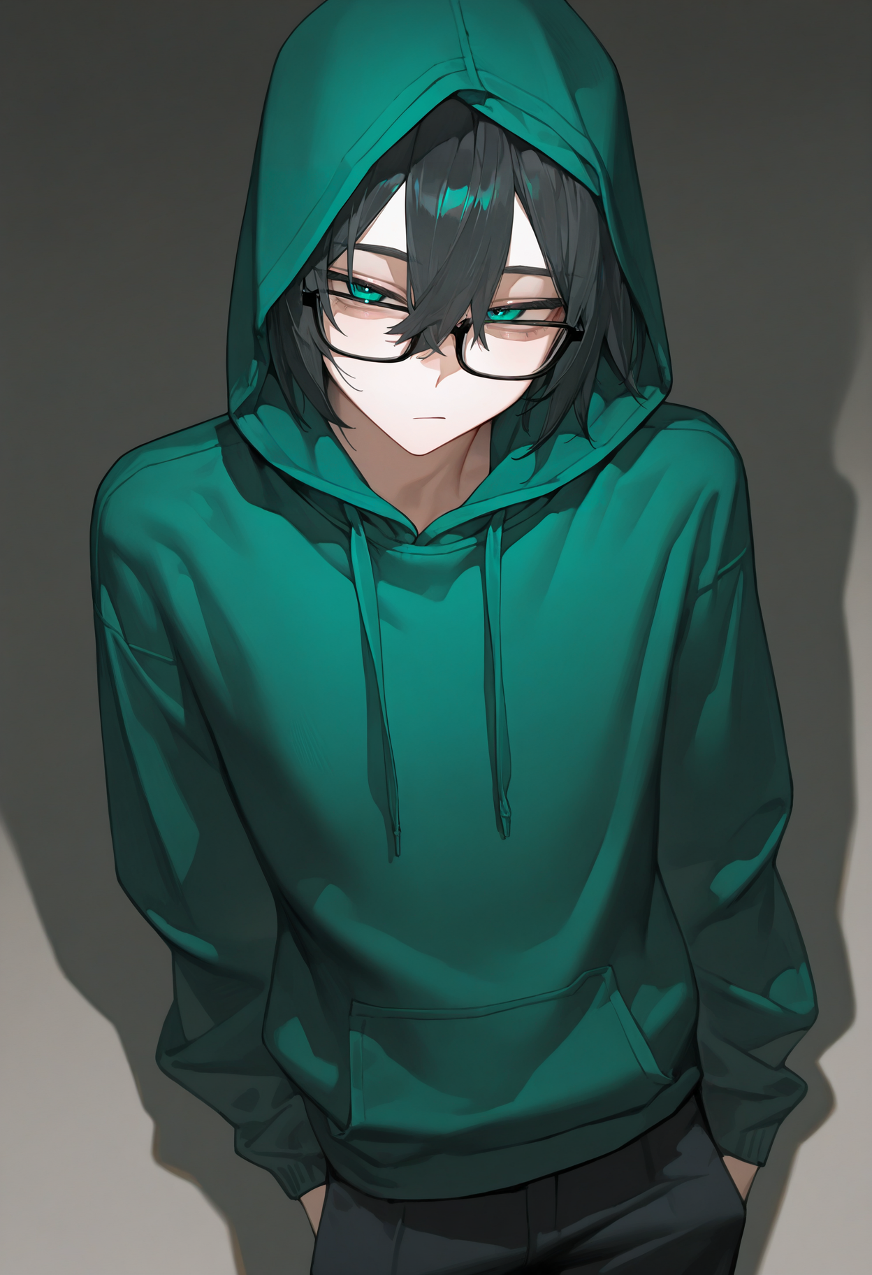 Vedal(人类形态)的触发词及外观: vedal987, 1boy, 黑色头发, 眼镜, 黑框眼镜, 绿眼睛, 中分刘海