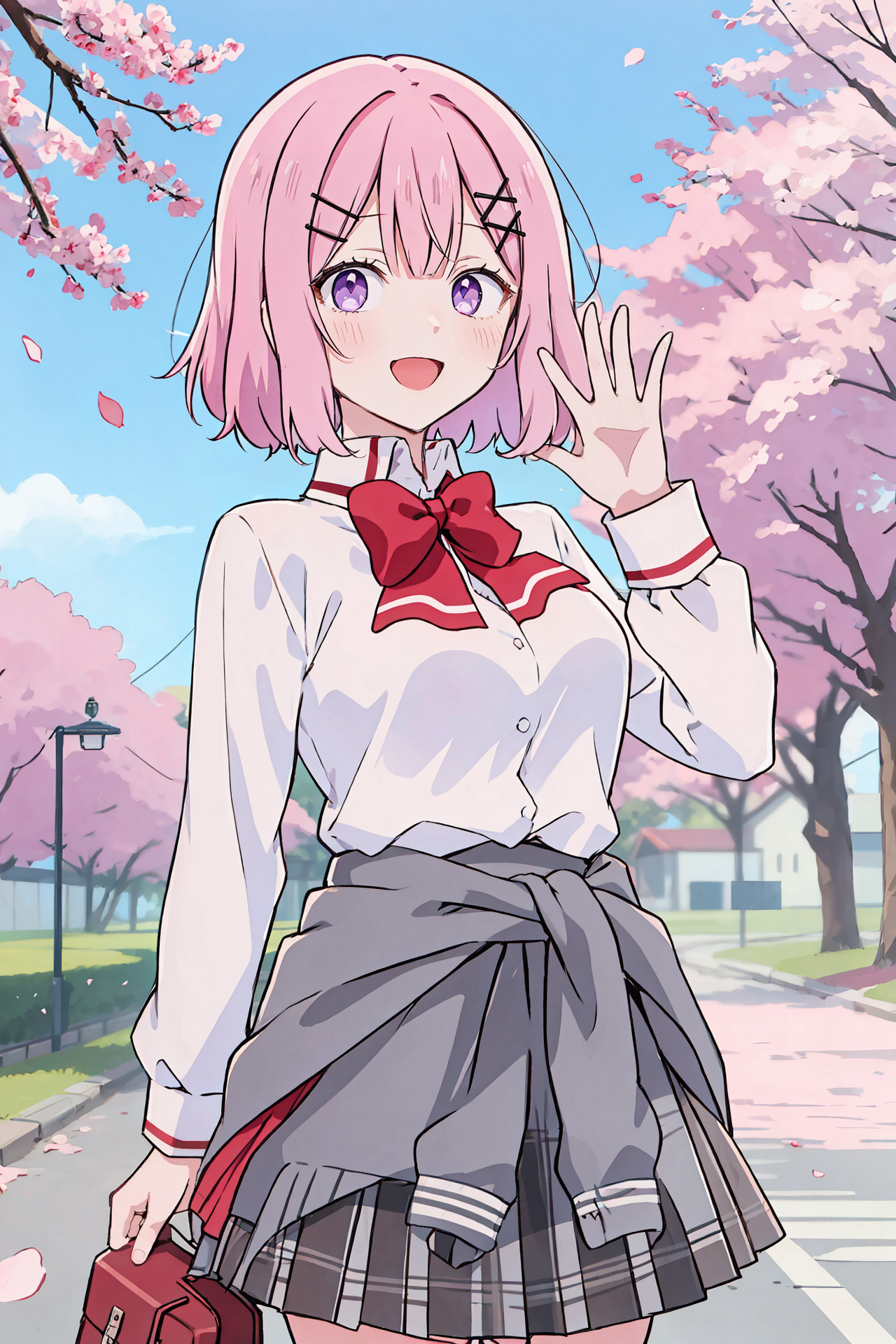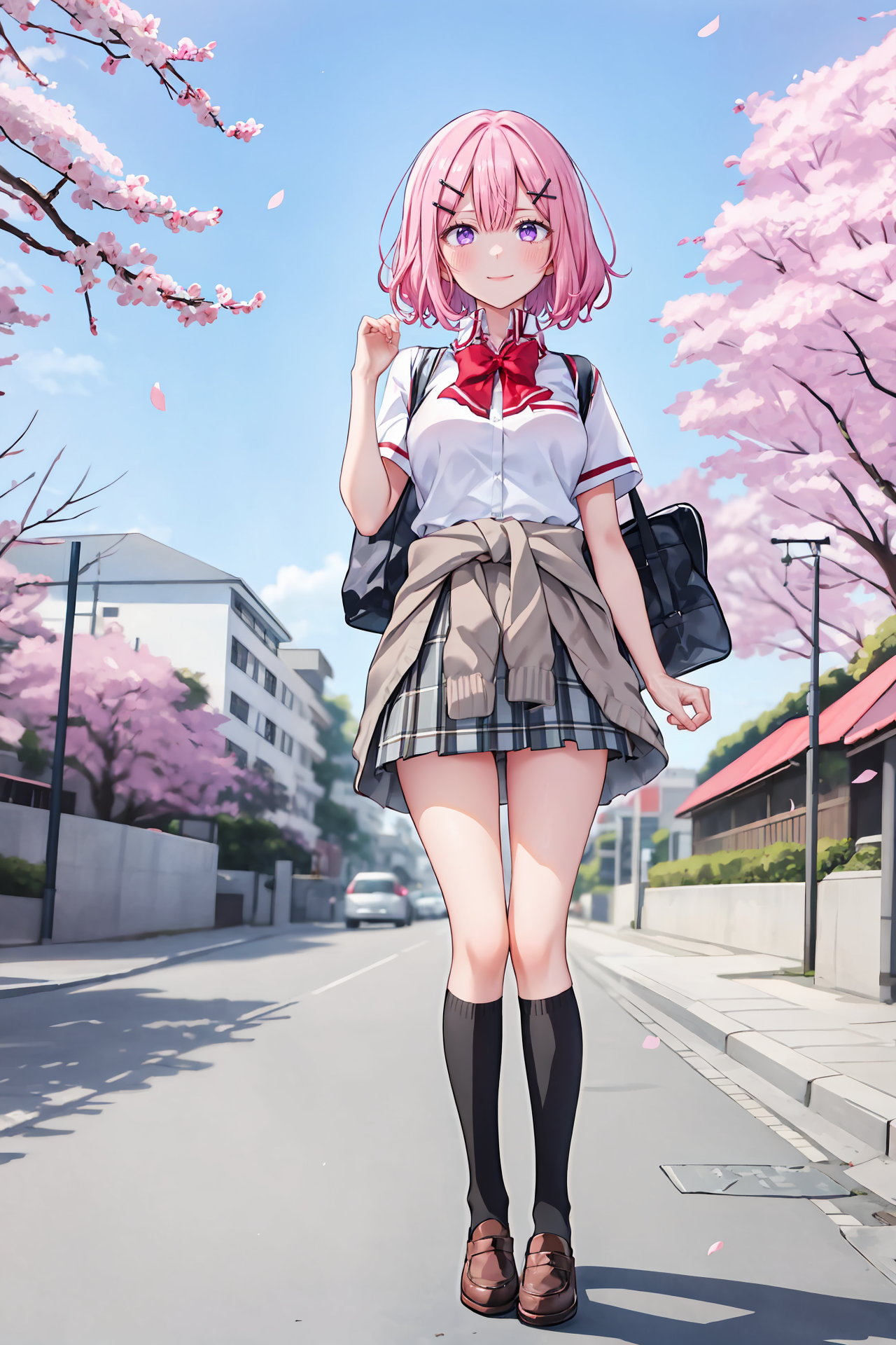 默认女高中生制服的附加提示:校服、百褶裙、格子裙、白色衬衫、红色领结、乐福鞋、腰间衣物、黑色袜子