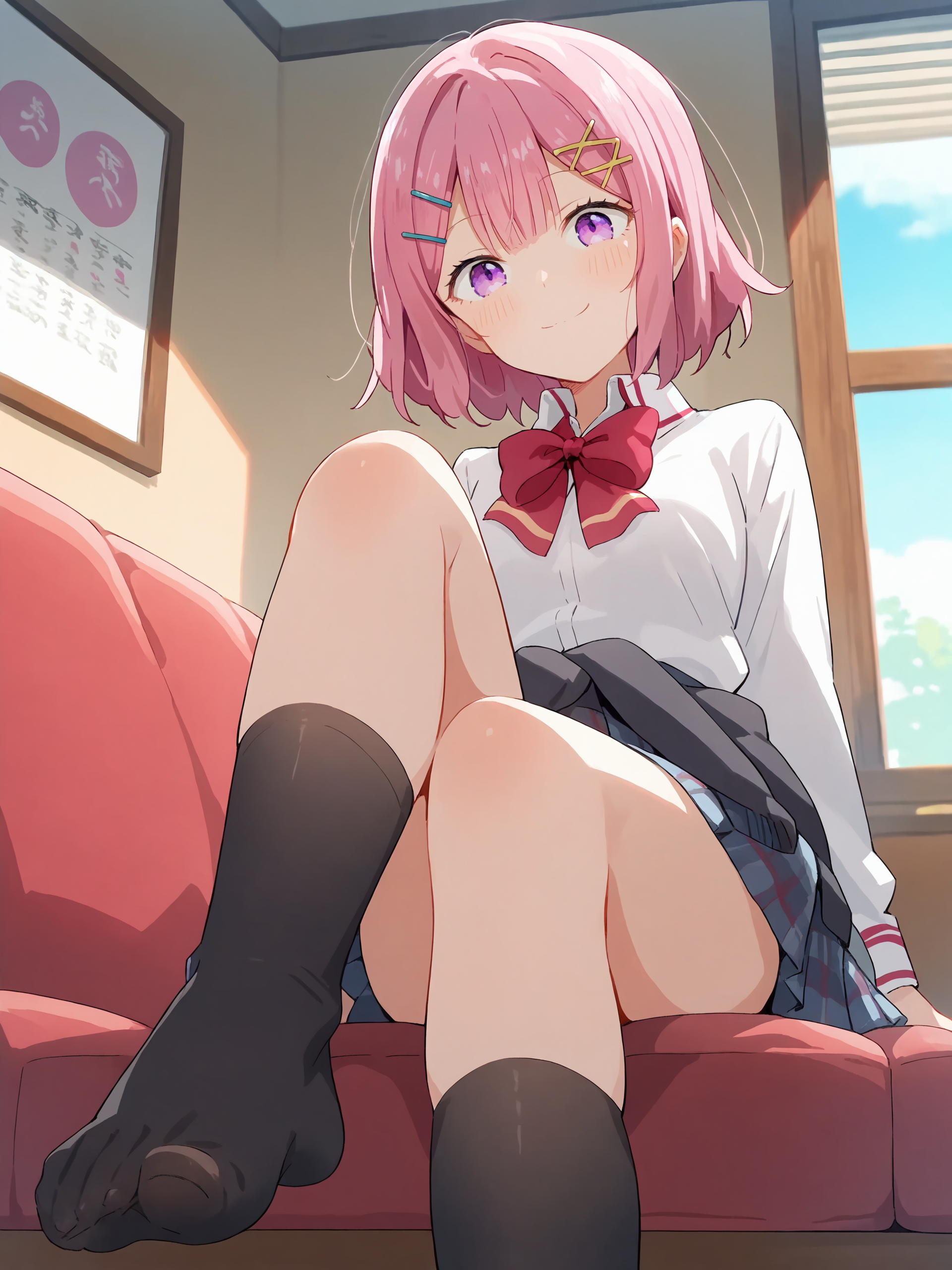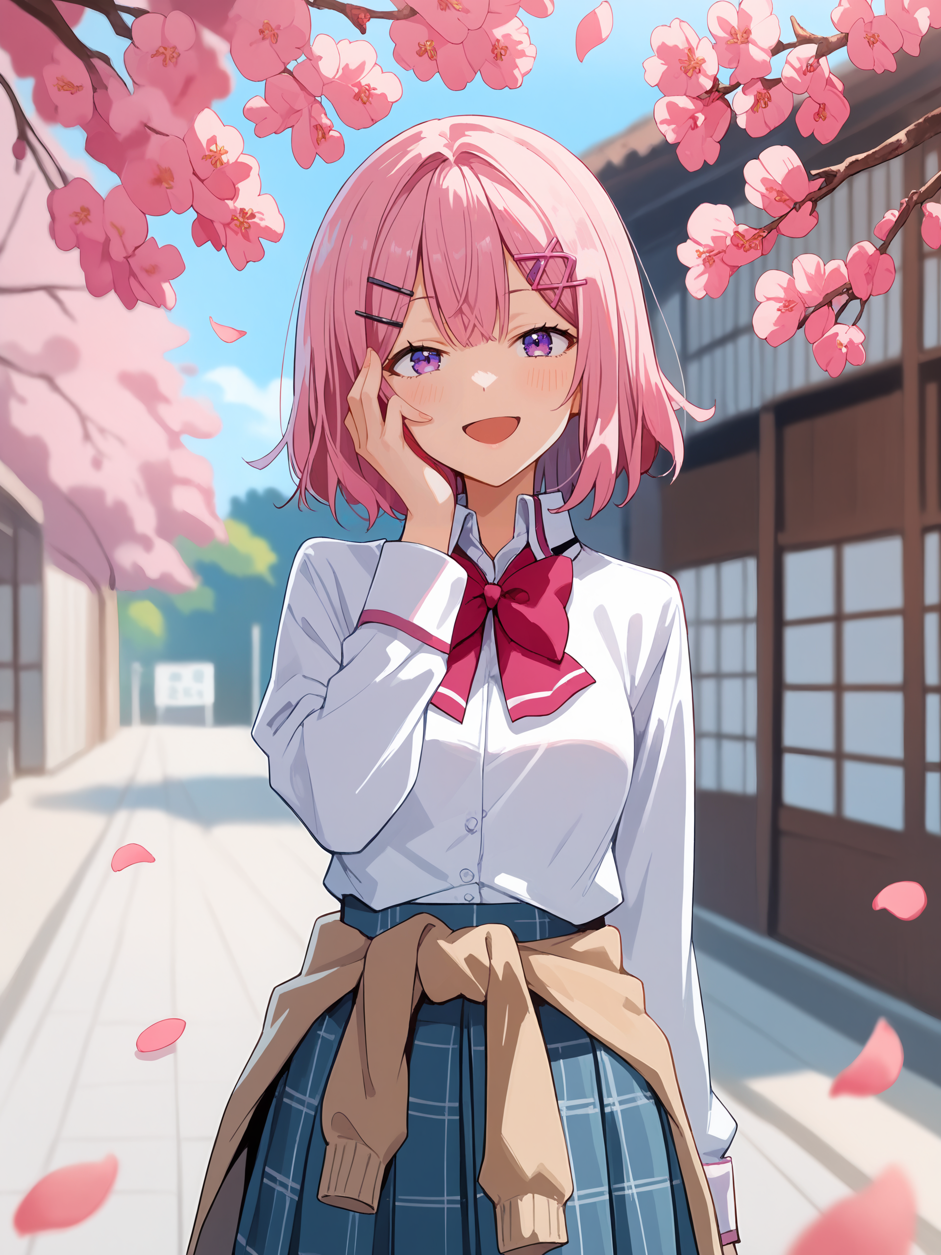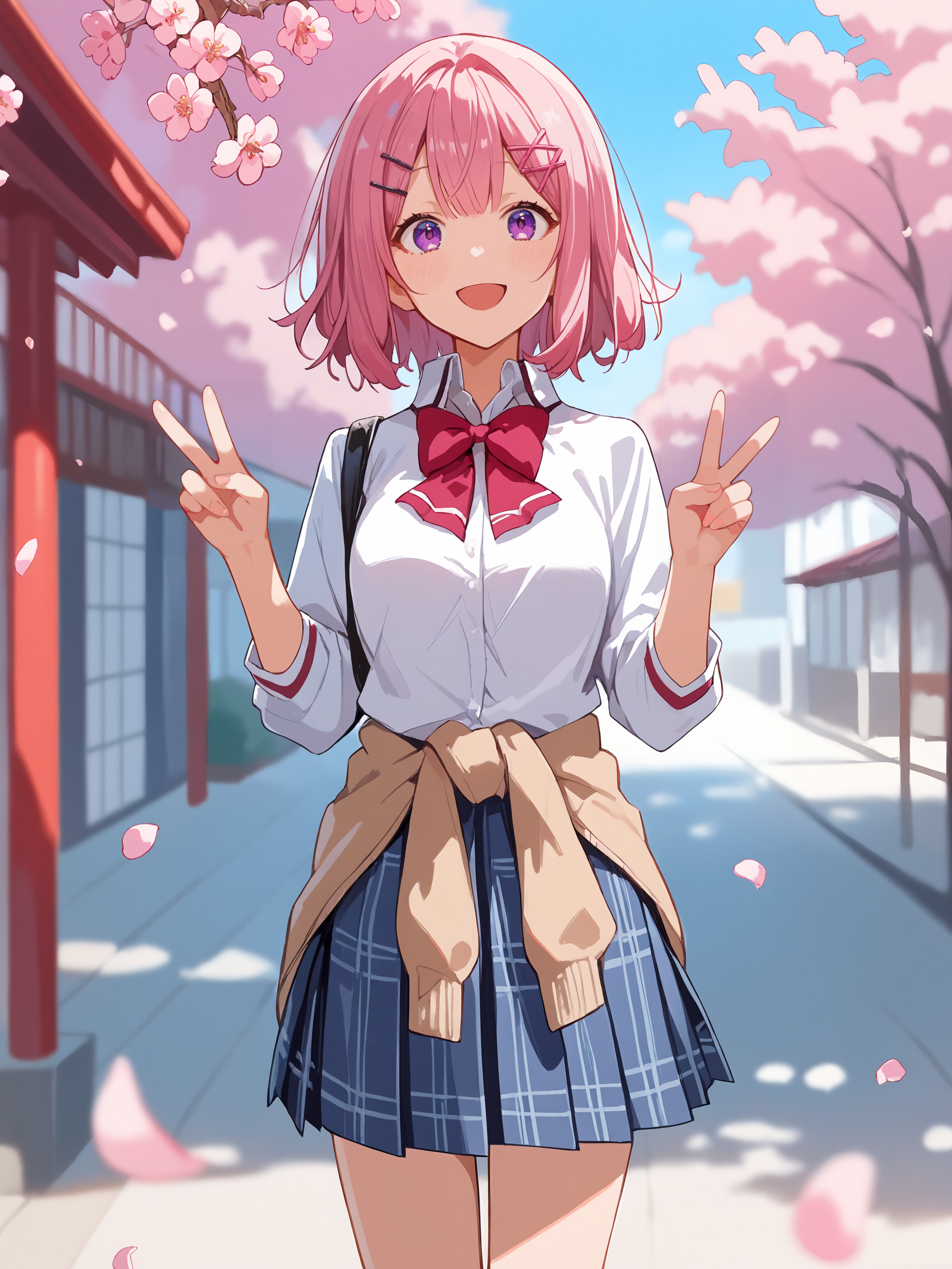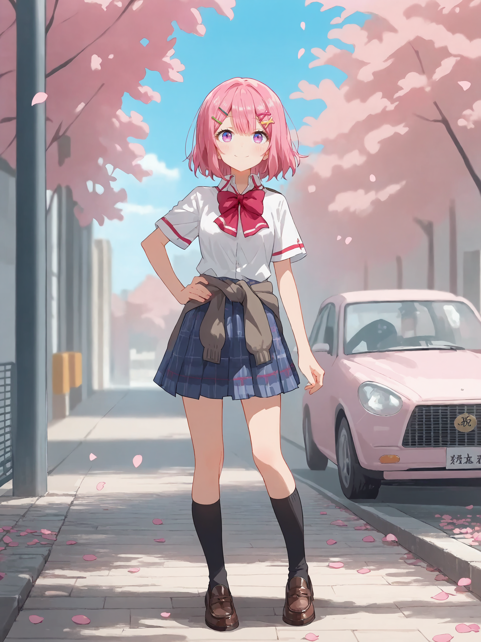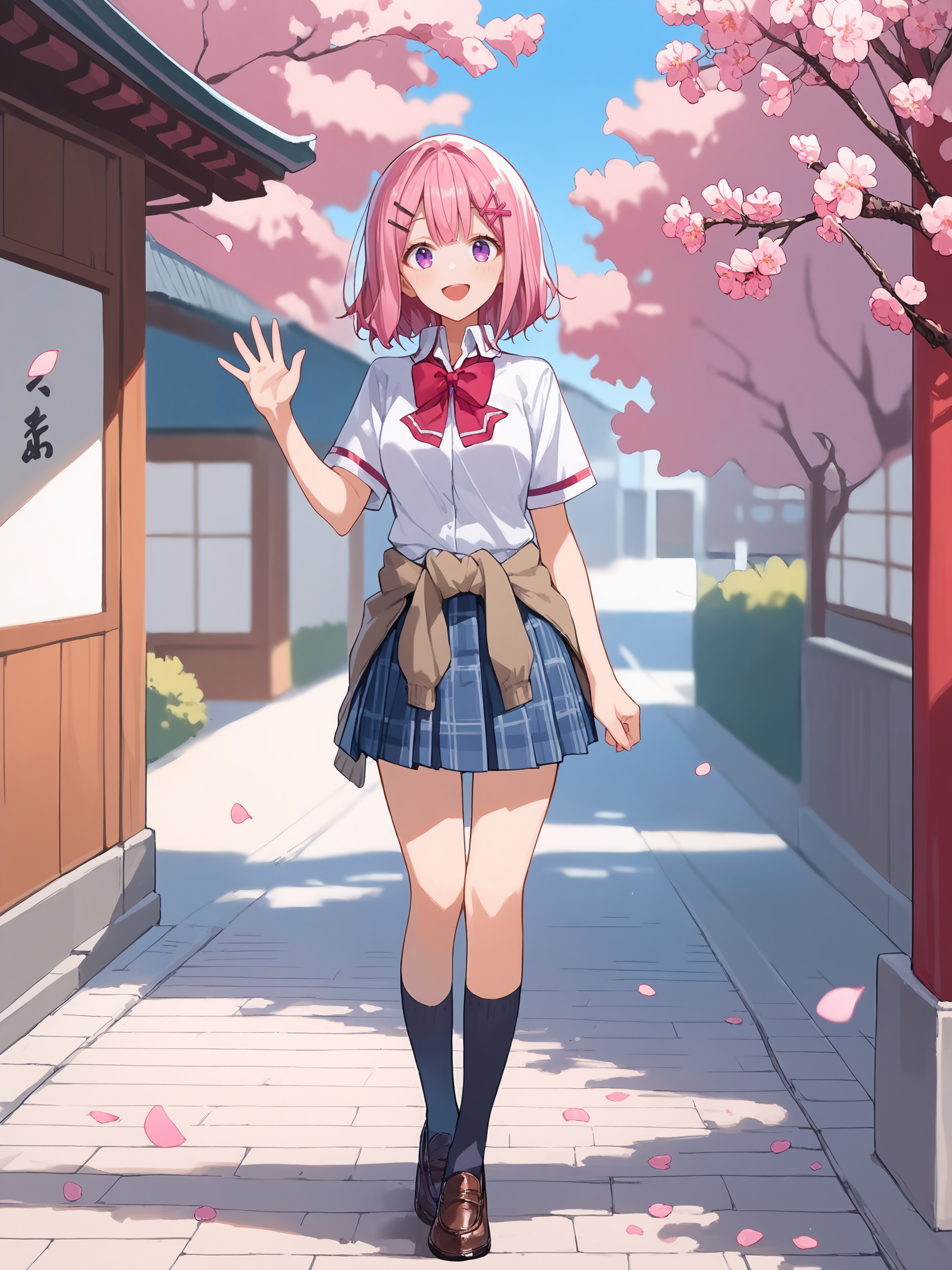 デフォルトのJK制服に関する追加プロンプト:school uniform、pleated skirt、plaid skirt、white collared shirt、red bowtie、loafers、clothes around waist、black socks