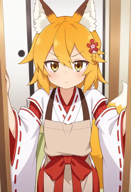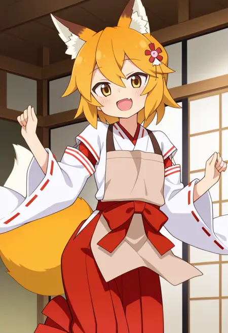 score_9, score_8_up, score_7_up, masterpiece, source_anime, 1girl, ct_s3nko, short hair, blonde hair, yellow eyes, fox ears, fox tail, hair flower, kimono, ribbon trim, brown apron, wide sleeves, detached sleeves, looking at viewer, indoors, upper body, claw pose, open mouth, blush, from below, leaning forward,
