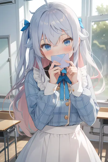 kagura nana, nana_third, long hair, two side up, blue bow, plaid, blue shirt, long sleeves, white skirt