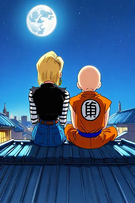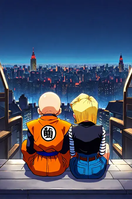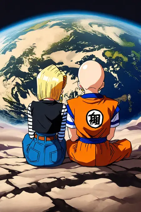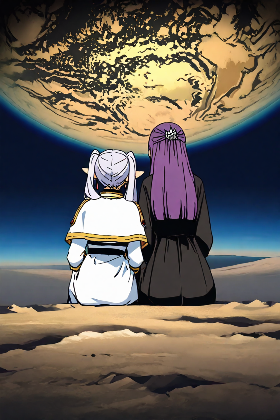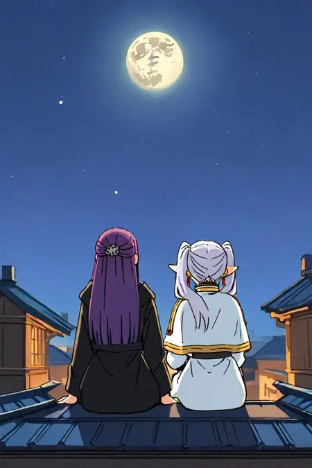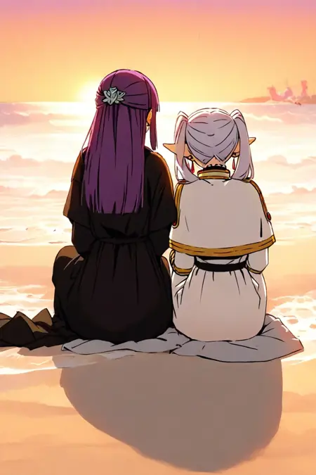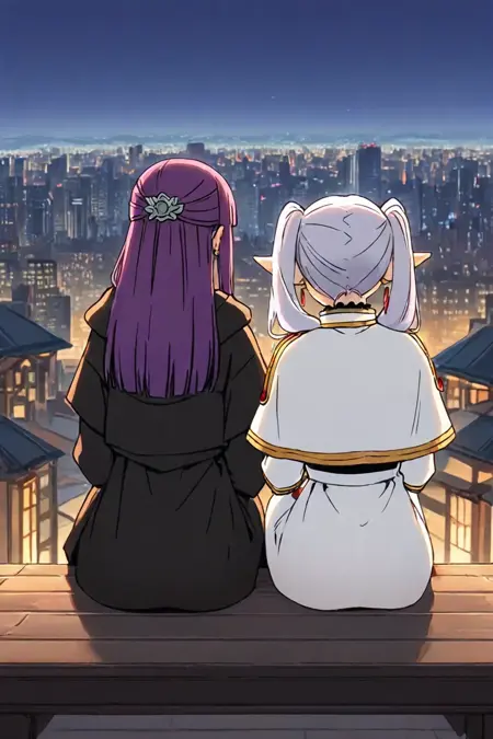 プロンプト: 座っている、横並び、後方から