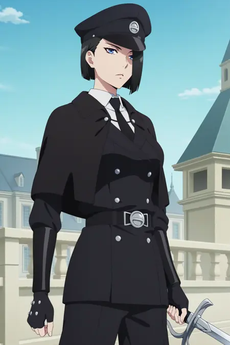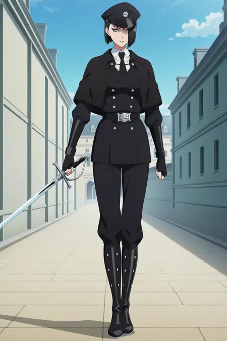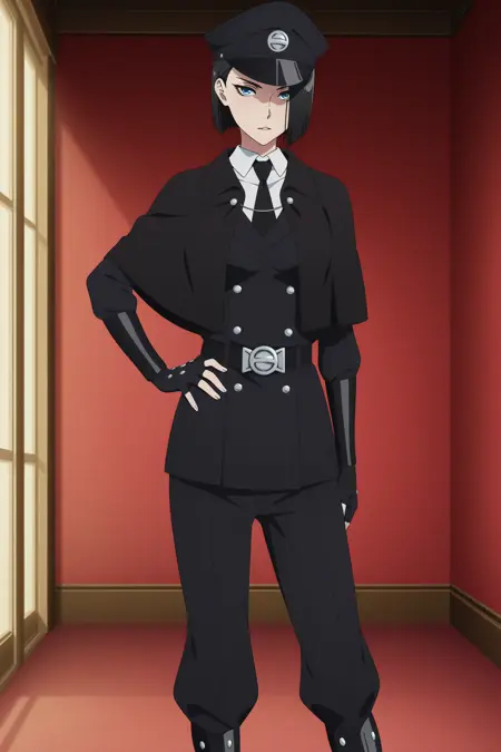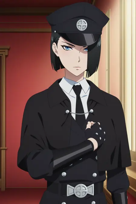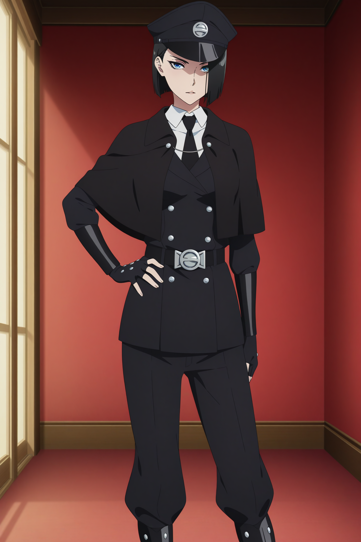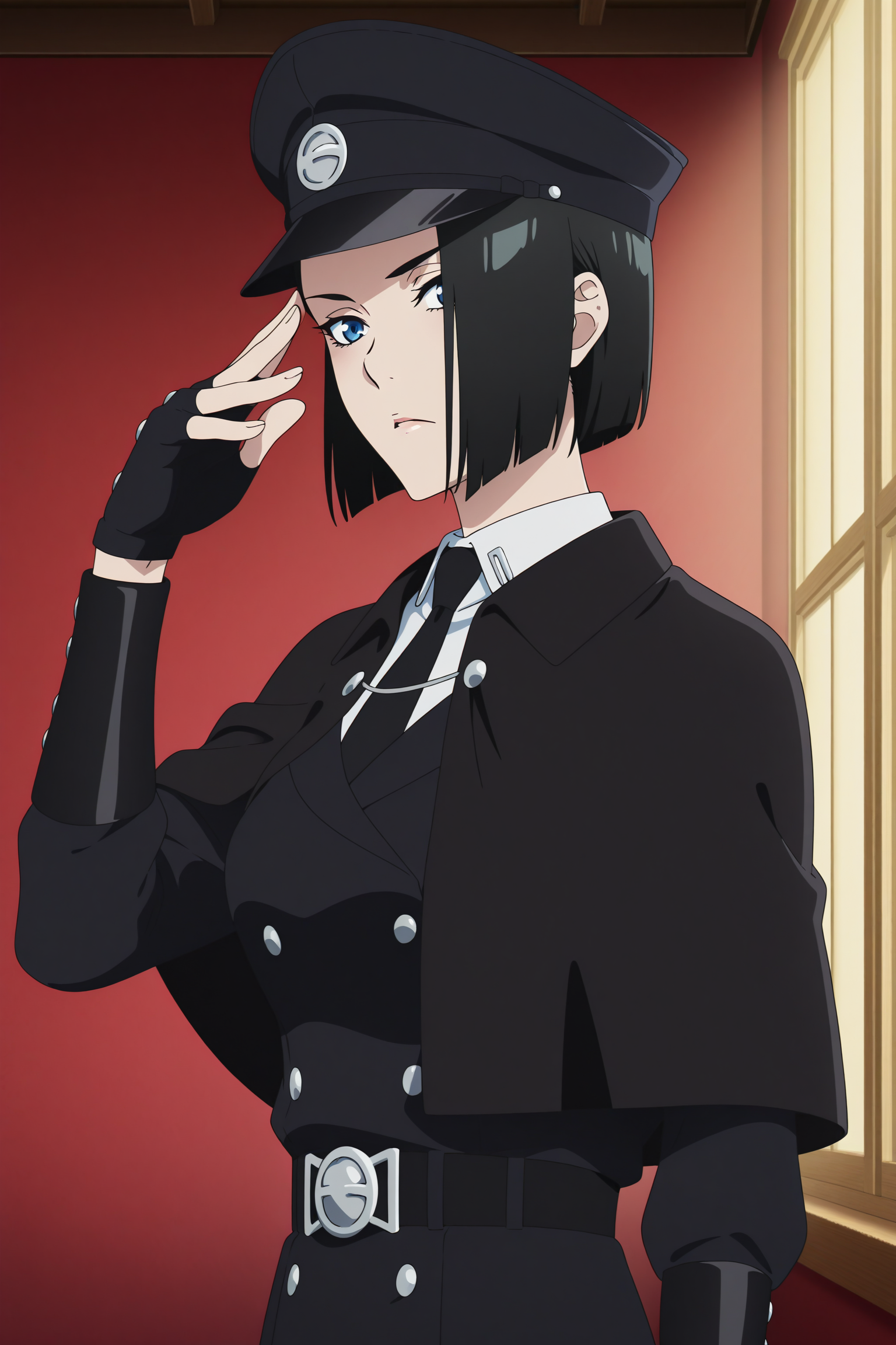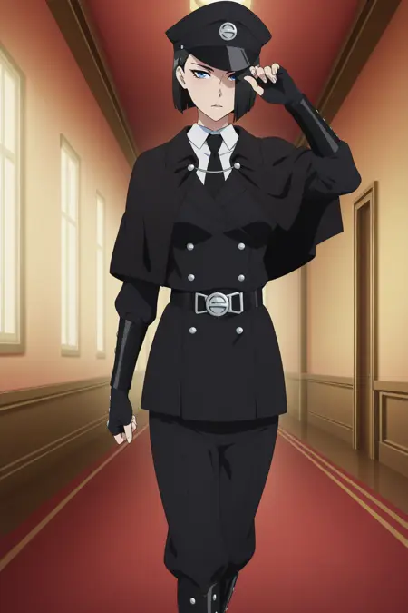 sullivan squire, short hair, black hair, bob cut, blunt ends, peaked cap, hair over one eye, blue eyes, uniform, long sleeves, capelet, white shirt, collared shirt, black necktie, black coat, black gloves, fingerless gloves, belt, black pants, black footwear, knee boots