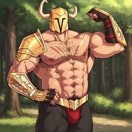 "auren, solo, 1boy, golden helmet with broken horn, muscular, abs, gauntlets, pauldron, pants"