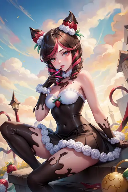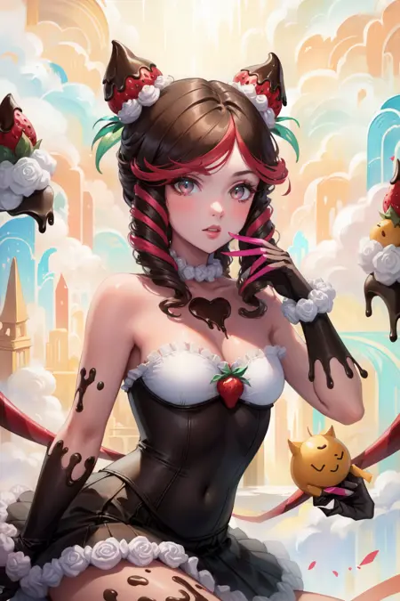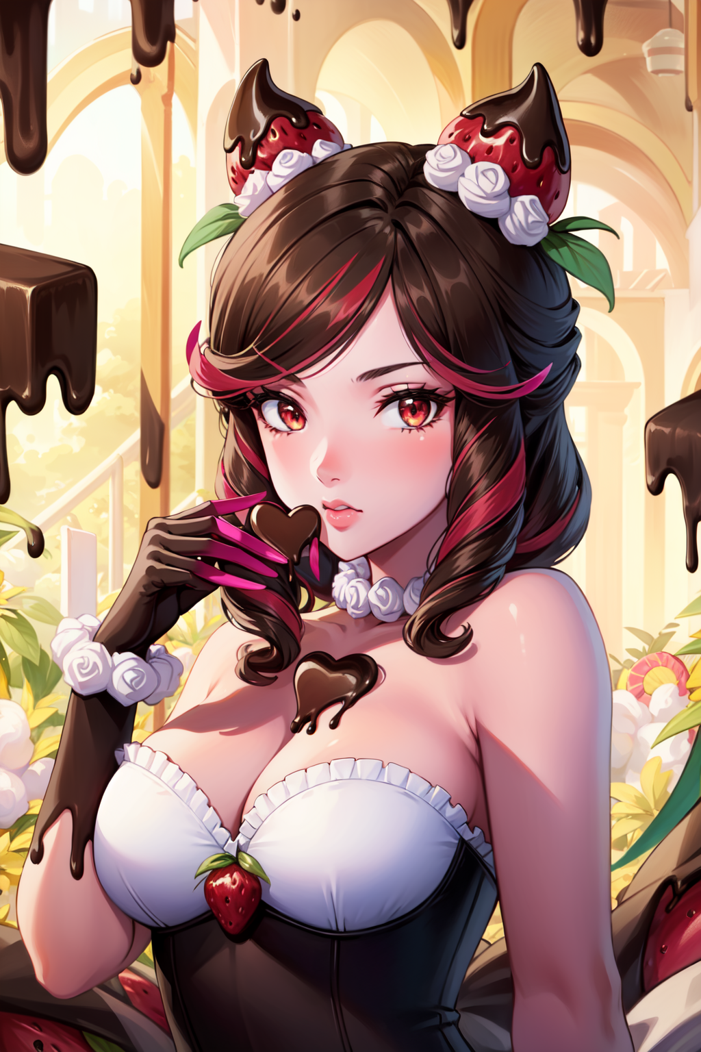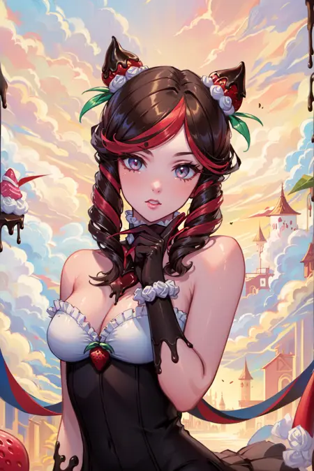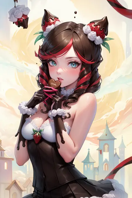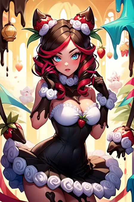 标签:sugar rush evelynn, 1girl, 无肩带连衣裙, 手套, 身体上的巧克力, 草莓发饰, 多彩发色